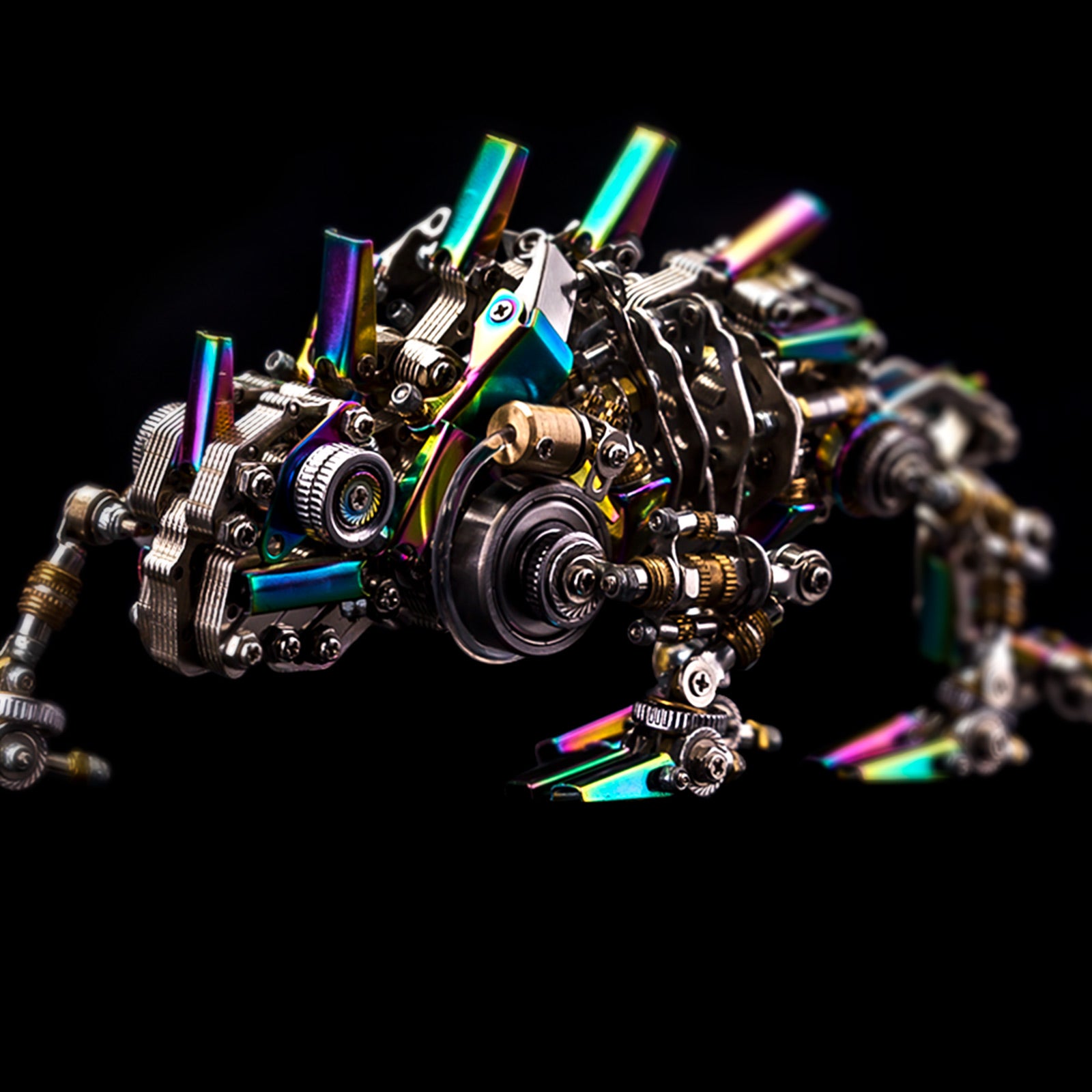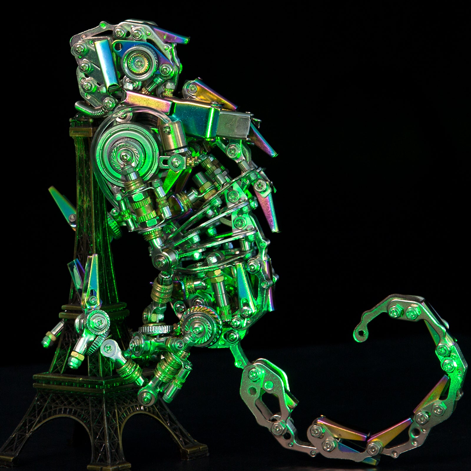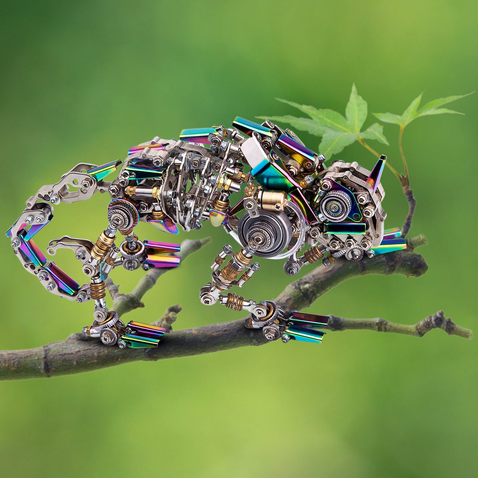 .Colored-Plating Metal And Vari-Colour: This mechanical Chamaeleonidae is made of many colored-plating metal parts for chromatic color under white light and corresponding color under other lights, such as under green and red lights, it will reflect green and red colors, which is incredible as if it is changing colors.