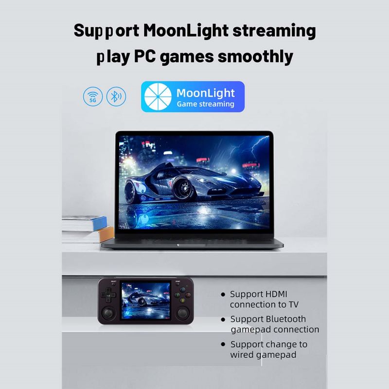 .Multi-function: Designed with hall joysticks for precision control, online multiplayer mode via WIFI and vibration motor, the game console is able to connect to 3.5mm stereo headphones, display&set various functional attributes like energy-saving settings and display brightness, archive and read, search games, check out the latest games you've played as well as bookmark your favorite games. It is capable of connecting to a computer, TV, monitor and projector through a universal HDMI interface and playing PC games by streaming MOONLIGHT.