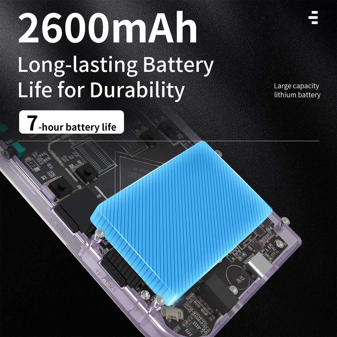 .Battery :2600mAH, lasts 7 hours. Charging 5V/1.5A, support C2C charger