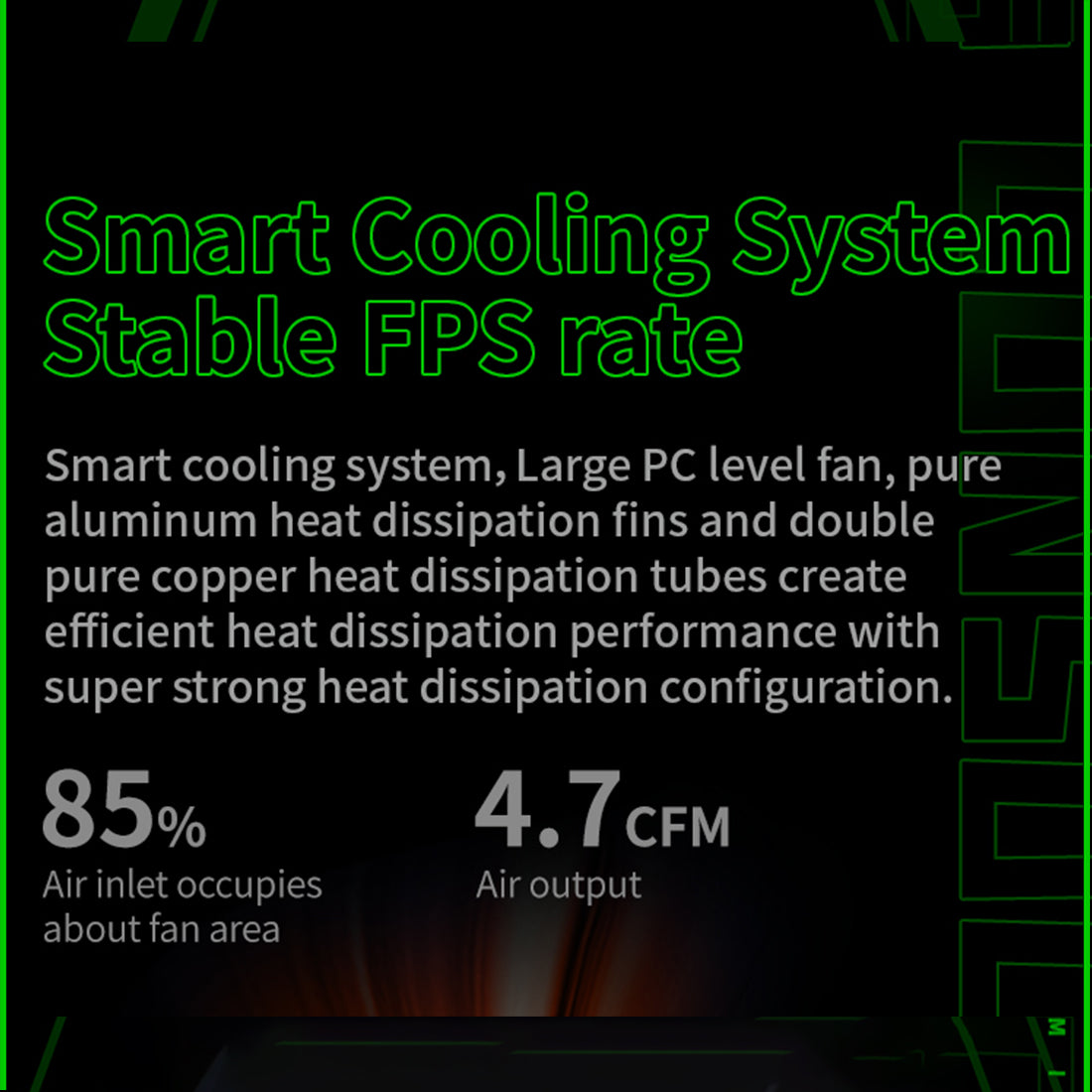 .Cooling: fan*1, pure aluminum heat sink*1, pure copper heat pipes*2, intelligent temperature control system