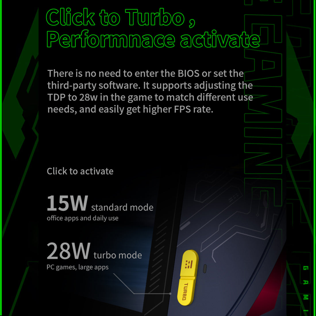 .One key Turbo for high performance mode. Easily activate the high frame rate mode without entering BIOS or third-party software settings, support to adjust the TDP up to 28W and match the different needs.