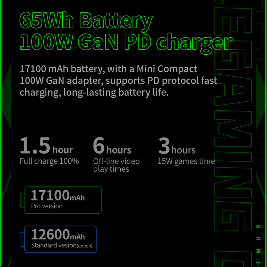 .Battery: 65wh extended battery, 17100mAh(3.85V),100W Gallium Nitride fast charge adapter.