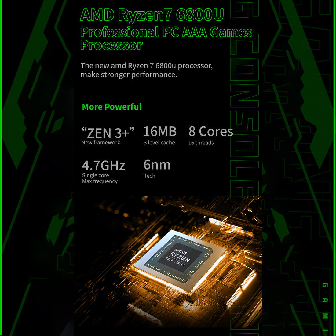 .Processor: AMD Radeon/Ryzen 7 6800U processor, 'Zen3+' architecture / 8 cores and 16 threads / 4.7 GHZ single-core MAX main frequency