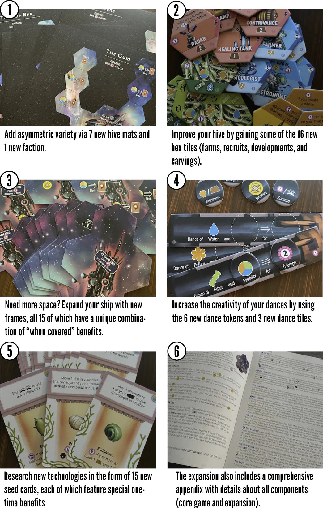 Apiary: Expanding the Hive adds to the variety of the core game with components all designed to fit inside the original insert and a comprehensive appendix that covers the core game and the expansion. It features a few bigger additions (7 new hive mats, 15 unique frames, and 15 new seed cards), along with a greater variety of tiles and tokens, plus a few updated components.