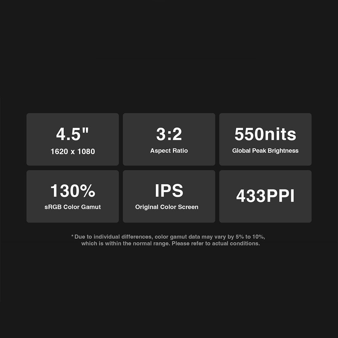 .Display: 4.5-inch IPS primary color borderless full screen 1620*1080 | 433 PPI | 130% sRGB color gamut