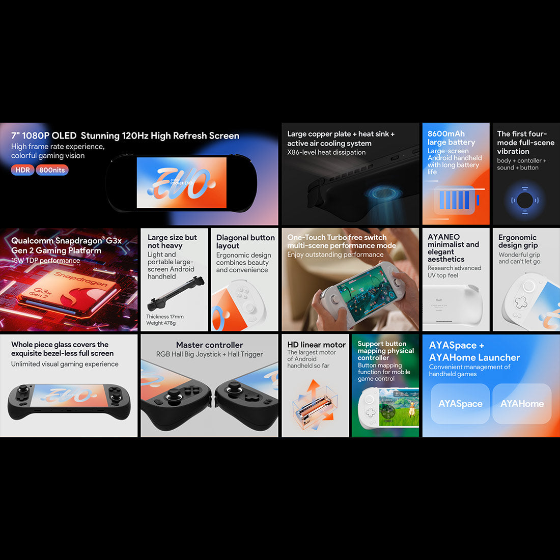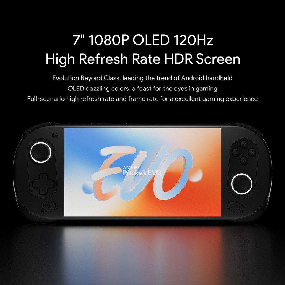 .Stunning 7-Inch OLED Display with High Refresh Rate: The AYANEO Pocket EVO features a vibrant 7' OLED screen with a 1920×1080 resolution and an ultra-sharp 315 PPI. Enjoy buttery-smooth gameplay with up to 165Hz refresh rate and HDR support. Peak brightness reaches 800 nits, delivering vivid colors and excellent clarity. A super-slim bezel and ergonomic design complete this premium visual experience.
