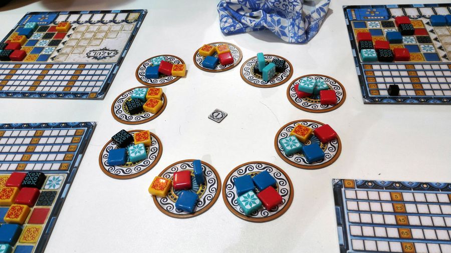 In Azul, players take turns drafting colored tiles from the center of the table and adding them to their player board. Later in the round, players score points based on how they've placed their tiles to decorate their board. Extra points are awarded for specific patterns and for completing rows, columns, and color sets. Tiles chosen by a player that cannot be used on their player board result in negative points. The player with the most points at the end of the game wins.