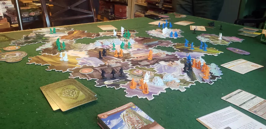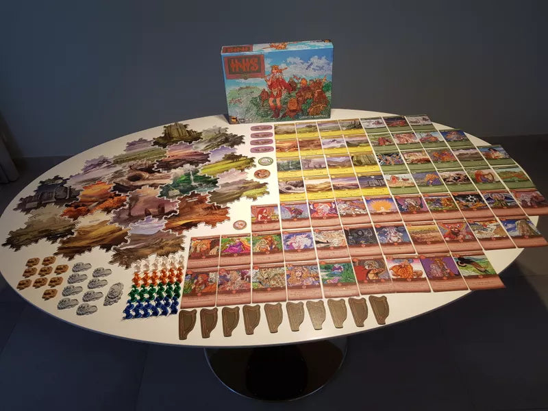 While Inis has 'dudes' that are 'on a map', it's a beginner's mistake to play this as a battle game because eliminating other clans reduces your chances of scoring a Leadership victory condition. Peace among different clans, with or without a clear territory leader, is the usual outcome of a clan's movement. Battles will occur, of course, as the Celtic clans can be unruly and a good player will listen to his clan's people (i.e., his hand of cards). That battle aspect is reflected in the clan's miniatures representing warriors. Woodsmen, shepherds, and traders complete the set of twelve minis for each player; these occupations have no impact on the game, but give it flavor.