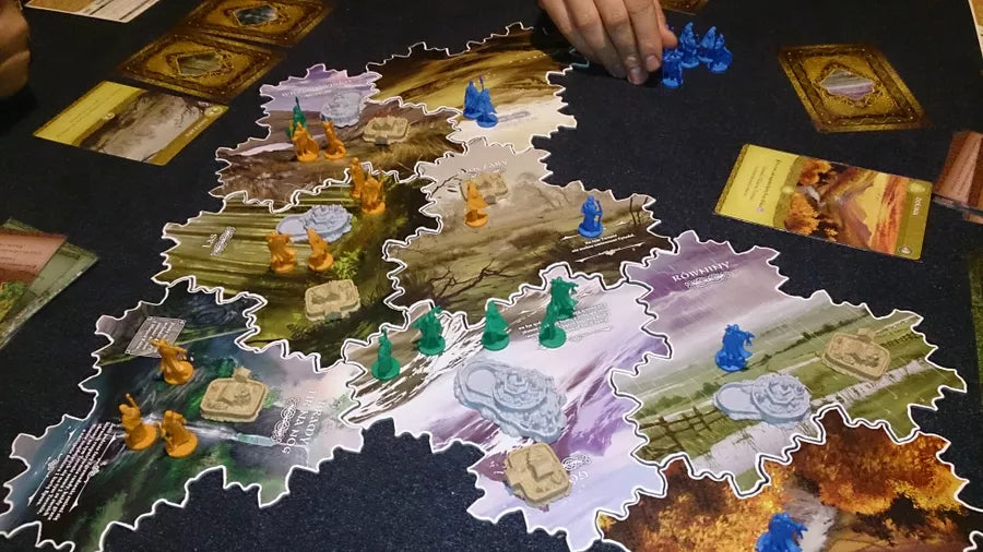 At the start of each round, players draft a hand of four action cards (with 13 action cards for three players and 17 for four players) during the Assembly. Action cards not played at the end of one season are not held for the next. Players also have access to leader cards for the territories that allow it and where they were elected leader during the assembly. Each Assembly reallocates those cards. Finally, they collect 'epic tales' cards that depict the deeds of the ancient Irish gods and heroes, like Cuchulainn, the Dagda, Lugh and many others. These will be kept and used to inspire the clans and achieve extraordinary feats...under the right circumstances. The cards provide a variety of actions: adding clans, moving clans, building/exploring, and special actions.