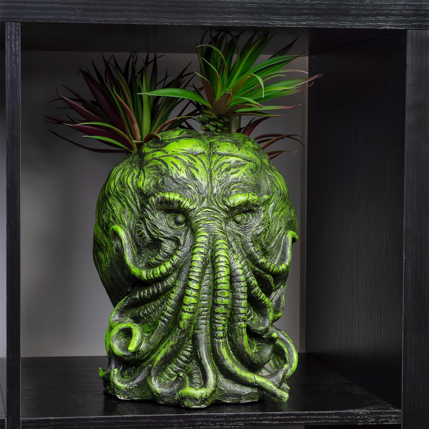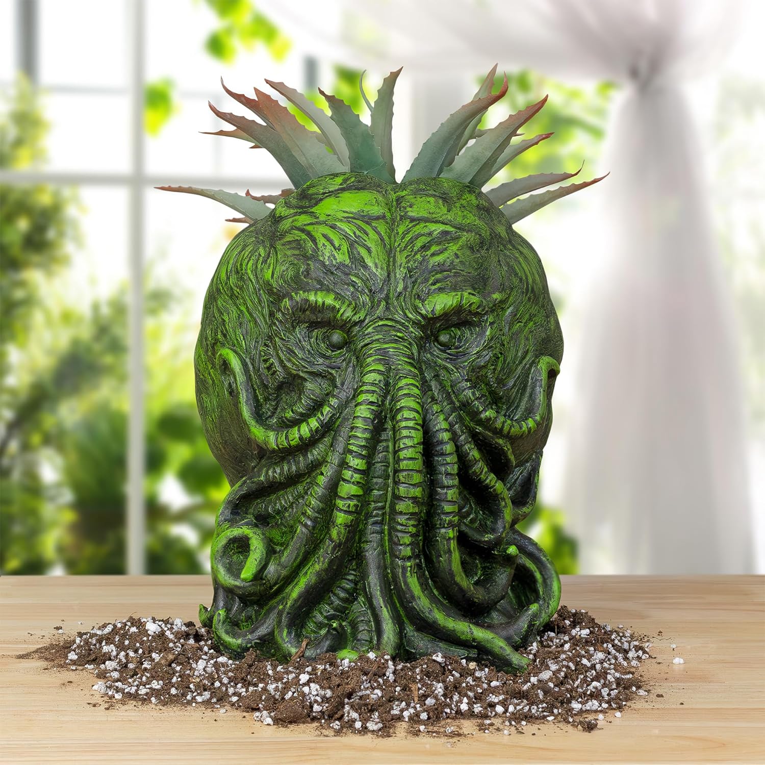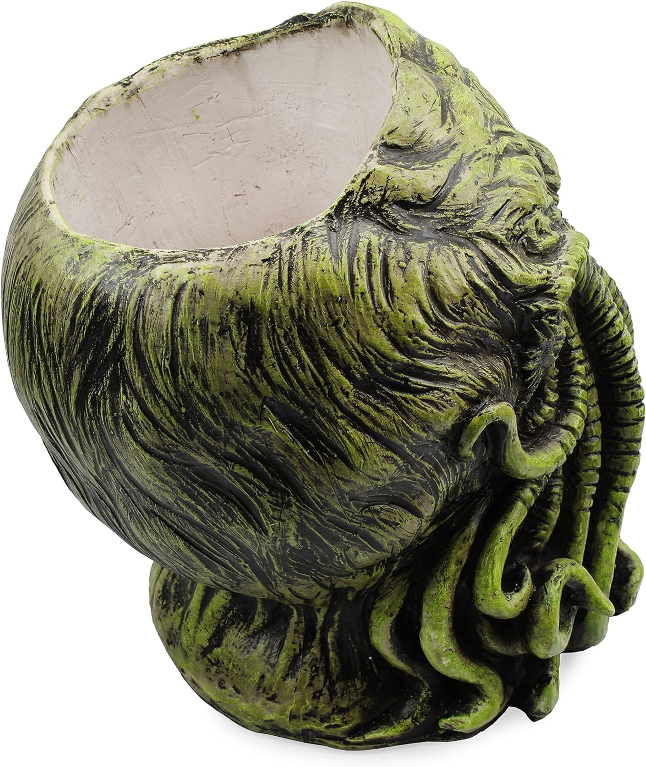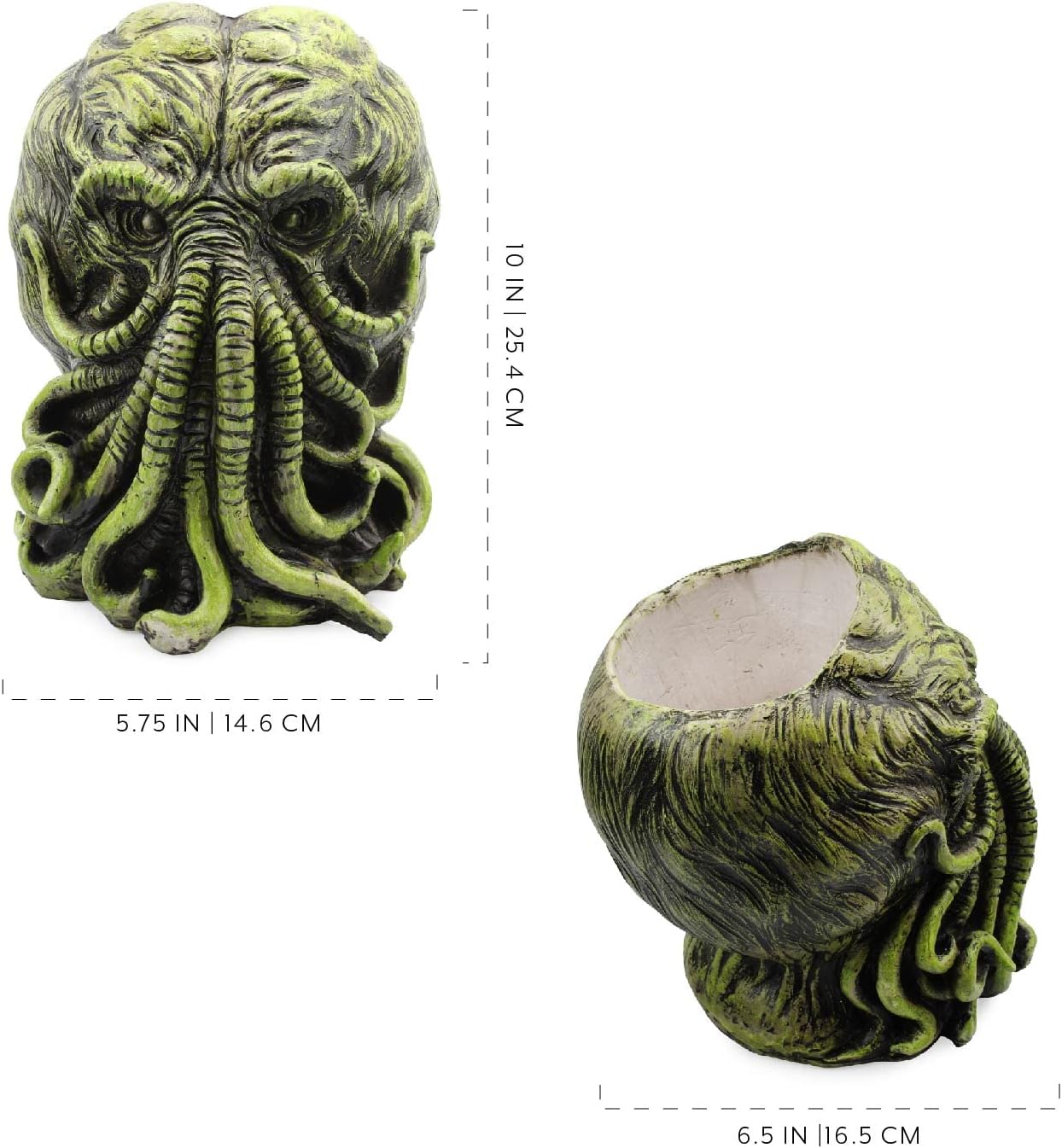 The dread of Cthulhu grows! Sew the seeds of chaos with this high quality, shockingly detailed Cthulhu planter from Toy Vault. Stands an impressive 11 inches in height, with a 5.5-inch deep cavity, and 5-inch diameter opening in which to grow your eldritch horrors. Convenient pre-drilled drainage hole helps keep roots healthy. Worshipfully hand painted in deep green with dark wash to enhance the details.