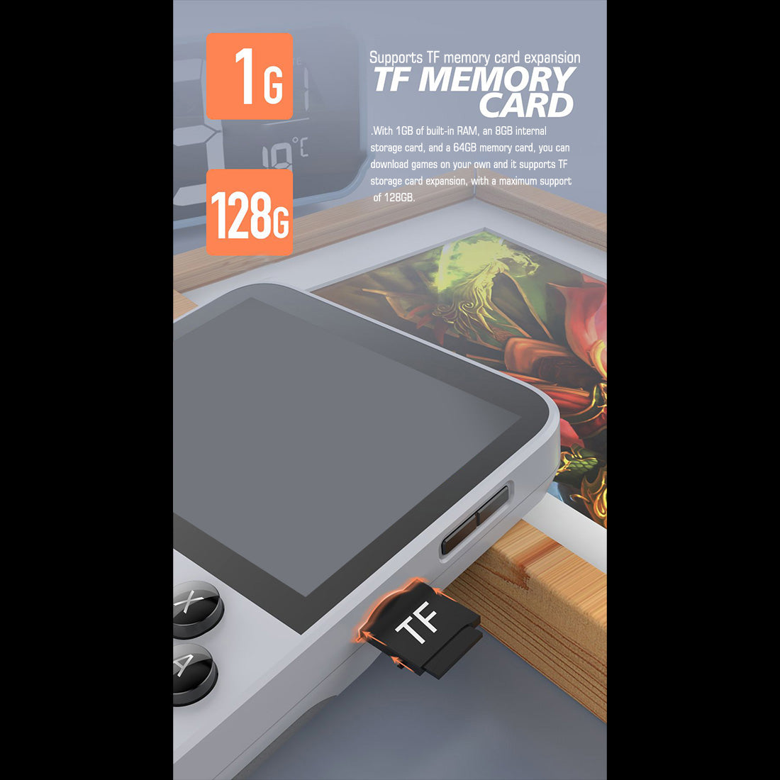- .Supports TF Card Expansion: Comes with 1GB RAM + 8GB built-in storage and a 64GB memory card, with the option to download games and support TF card expansion up to 128GB.