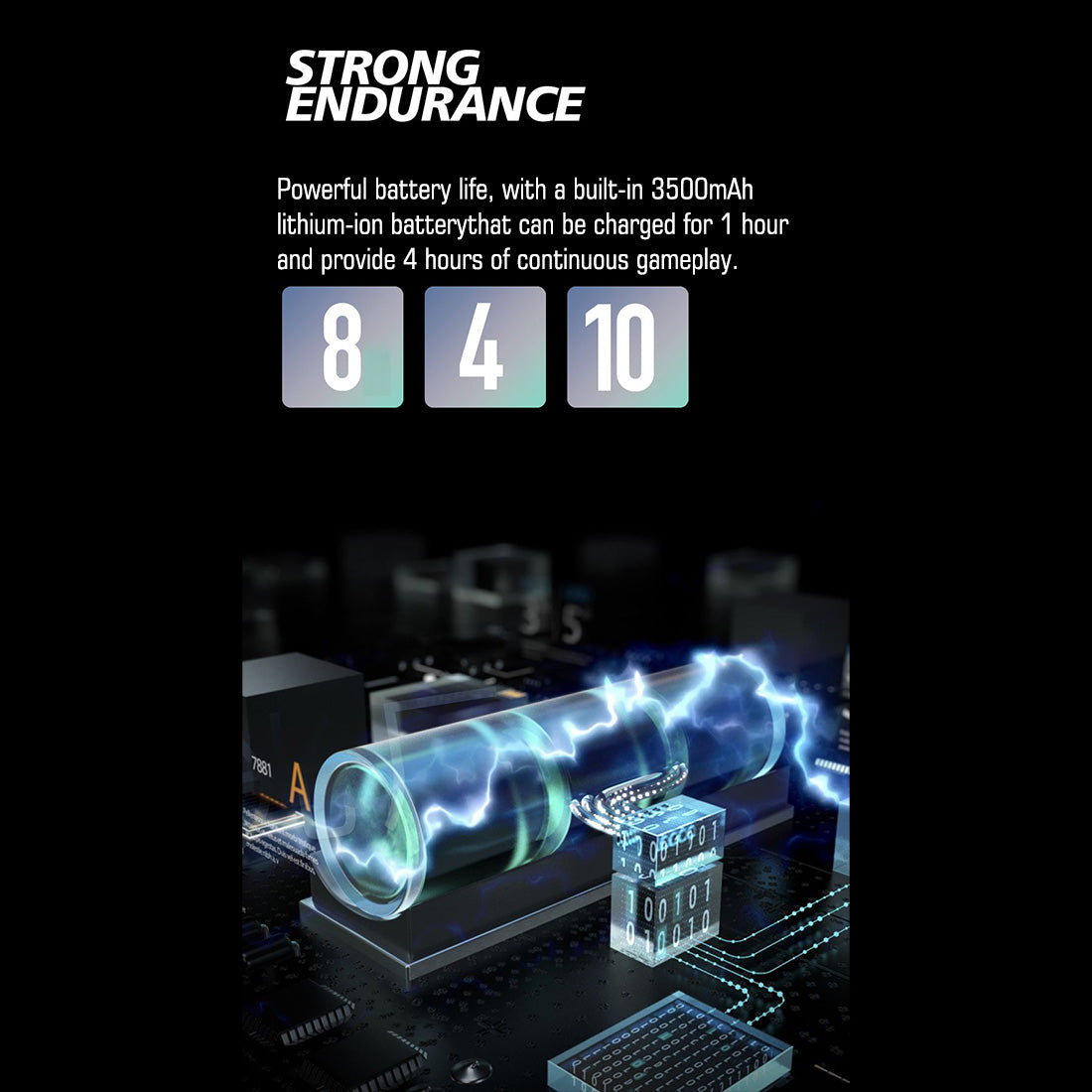 - .Built-in 3500mAh Lithium-ion Battery: Allows for 4 hours of uninterrupted gameplay on a single charge of only one hour. With a full charge, it offers 8 hours of battery life and remains on standby for up to 10 days.