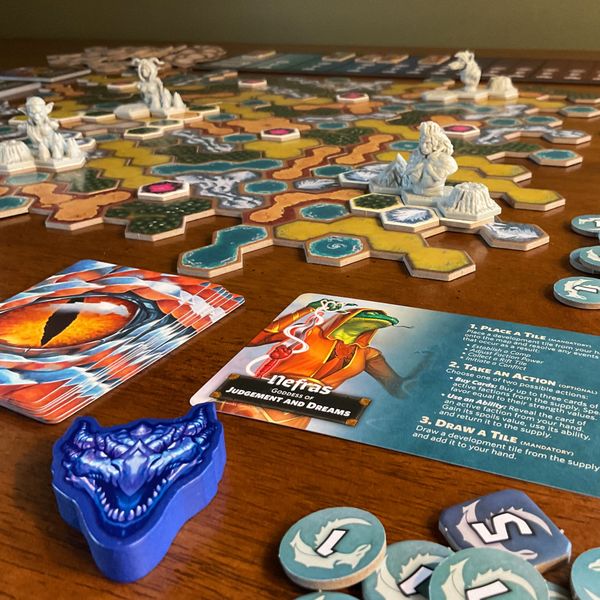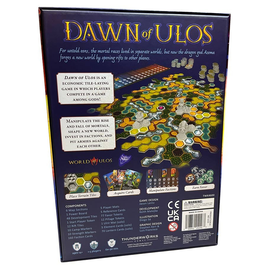 Dawn of Ulos is an economic tile-laying game for 1-5 players. You compete in a game among gods of the planarverse, wagering on and manipulating the rise and fall of mortals.