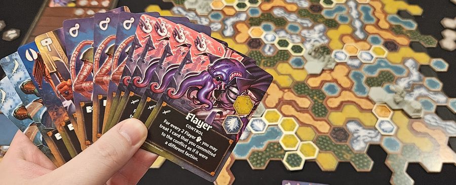 Mechanic: Card Play Conflict Resolution, Hand Management, Hexagon Grid, Investment