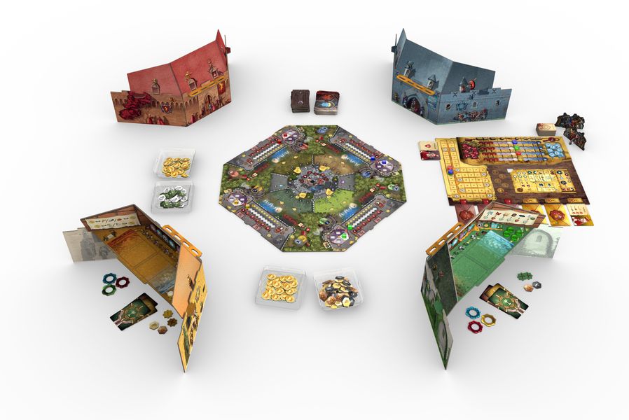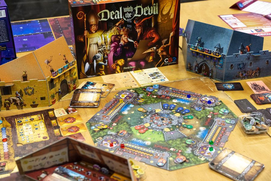 Deal with the Devil is a deeply thematic competitive Eurogame set in a fantasy medieval era. Each of the four players takes on a secret role of a mortal, a cultist, or even the Devil. Due to the asymmetrical roles, players experience the same game but with different game goals every play.