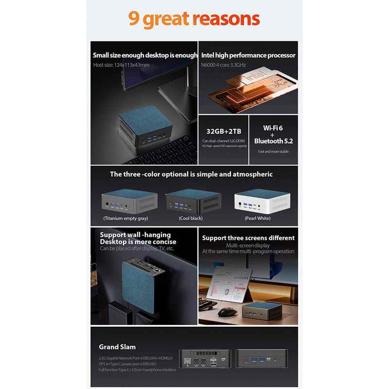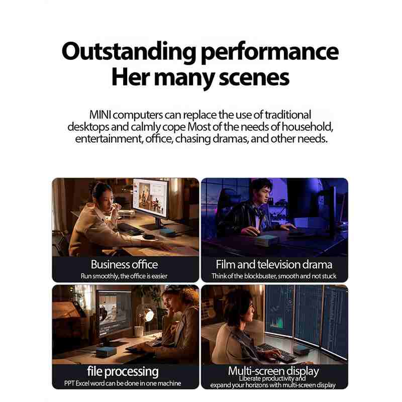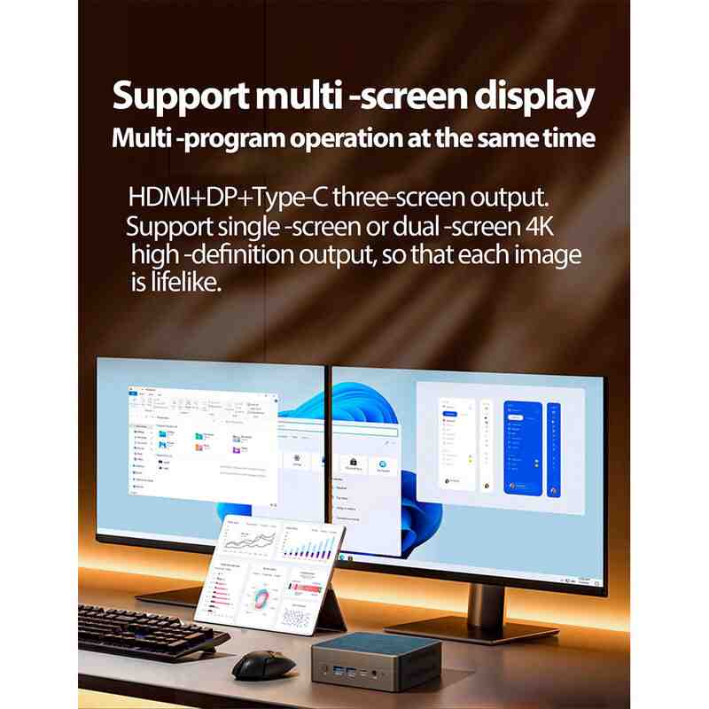 .Mini PCs are compact computer hosts, significantly smaller in size compared to traditional desktop hosts. They are designed to be compact, lightweight, suitable for small spaces, or mobile environments..Equipped with powerful computing capabilities, advanced processors, high-capacity memory, and fast storage devices, supporting triple-display output and run various tasks, including office applications, media playback, and light gaming.