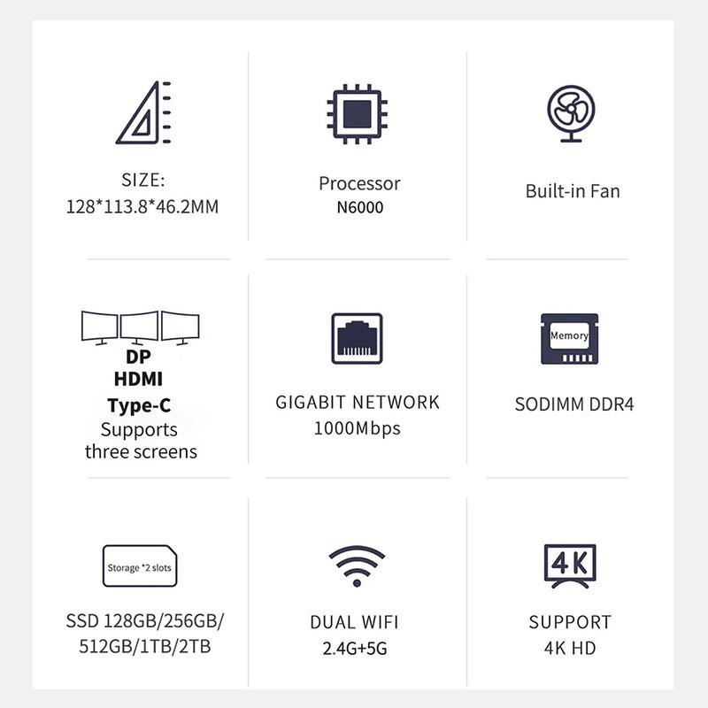 .CPU:Intel N6000 1.1GHZ-3.2GHZ(6W, 4-core,4-threaded)