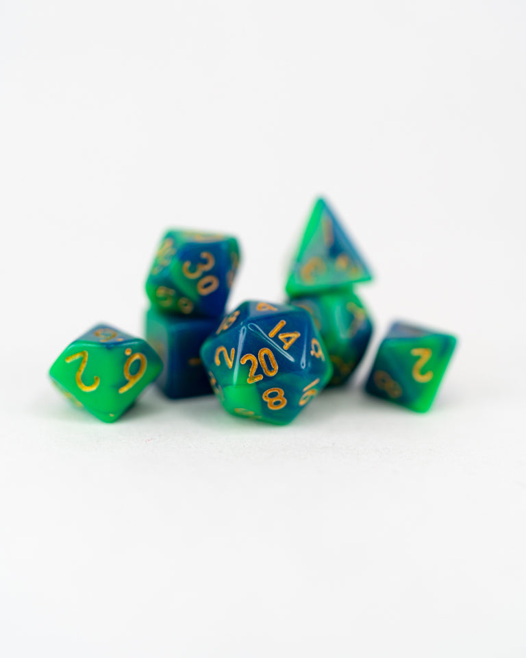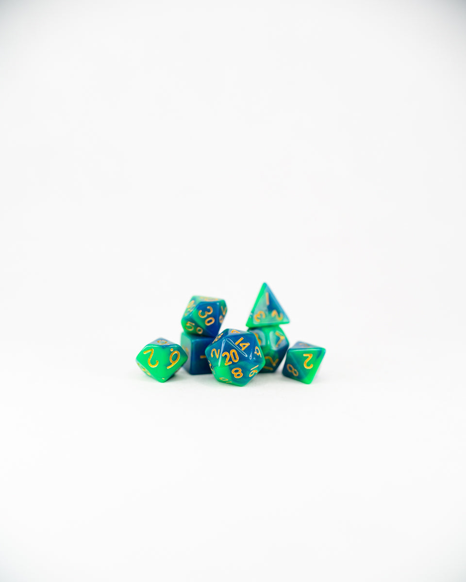 7 piece polyhedral RPG set, 13mm d20, delivered with a cork-stoppered glass vial with our signature wax seal.