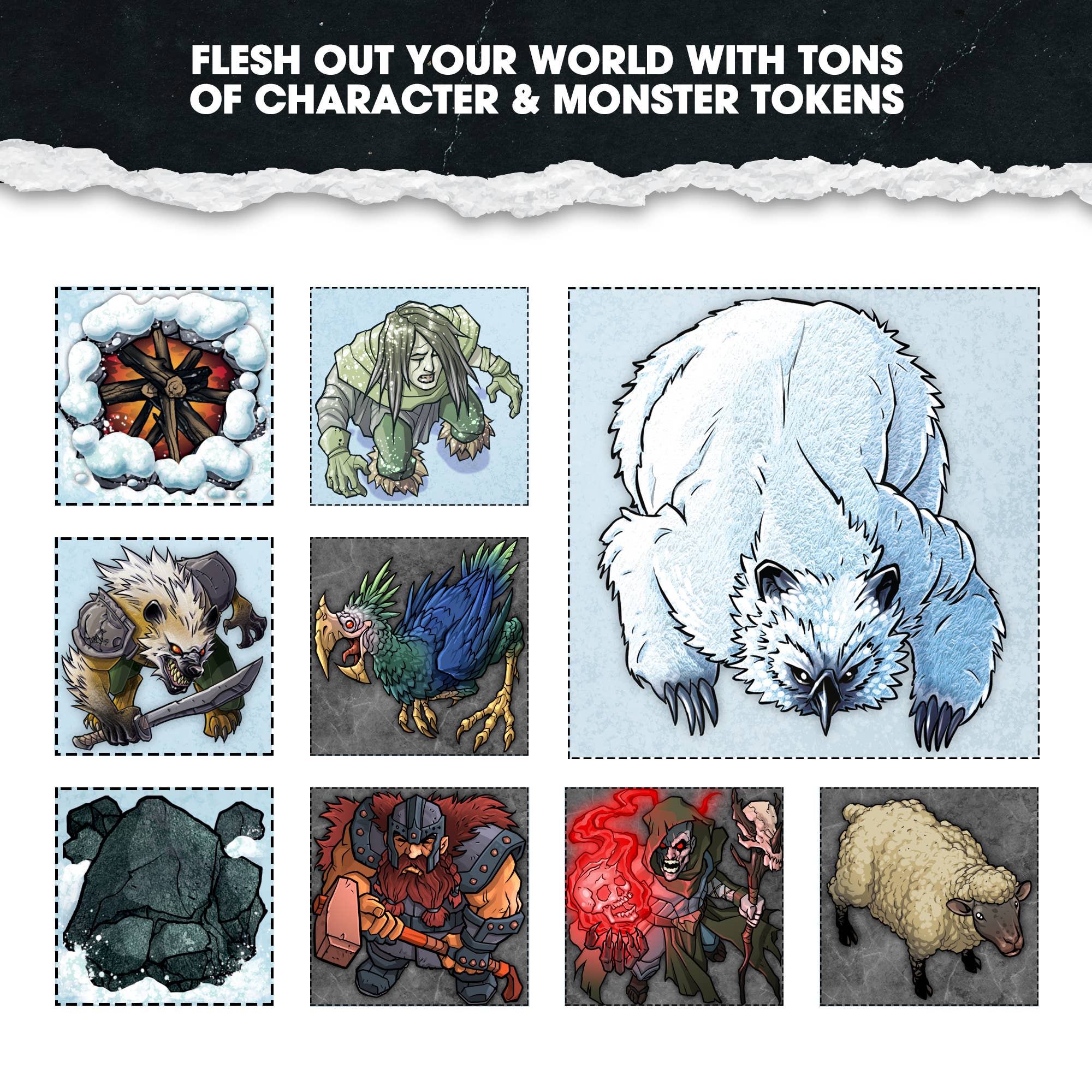 Introducing Dungeon Craft, the ultimate toolkit for Dungeon Masters (DMs) and players seeking immersive RPG terrain! Each book contains custom TTRPG terrain map titles, making it perfect for fantasy tabletop terrain. Laminated for wet-erase and dry-erase compatibility, these customizable RPG pieces are compatible with Dungeons and Dragons, Pathfinder, Warhammer 40k, Shadowrun, and other TTRPGs.Includes: snowy trees, tents, rocks, wagons, buildings, and more. Perfect for Icewind Dale (D&D) and compatible with the Snow & Wood BattleMap.