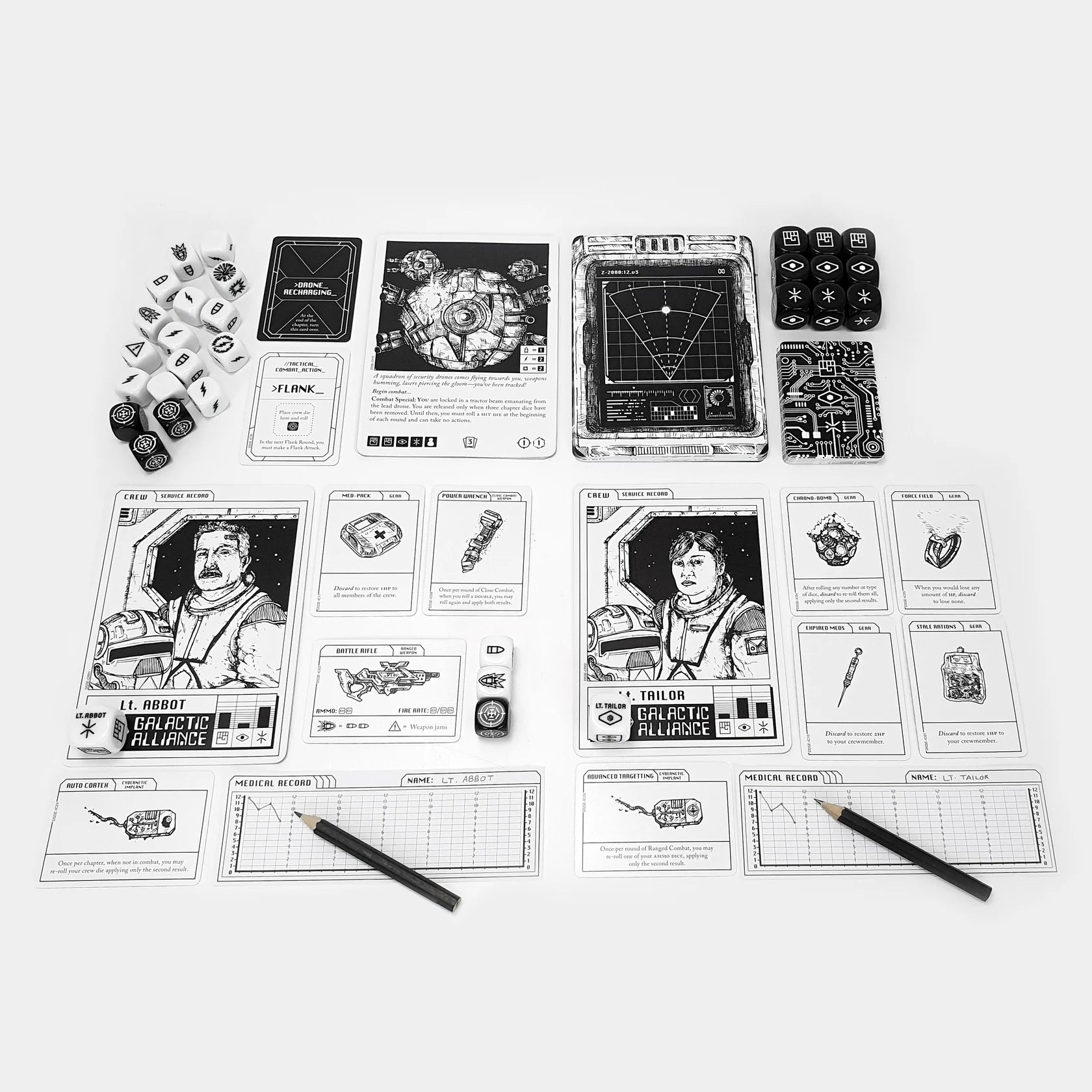 Along the way, the crew will have to overcome a variety of dangers, traps, and terrors. From cyborg guards and faulty replicators to killer alien organisms, each challenge is represented by a large, beautifully illustrated chapter card.