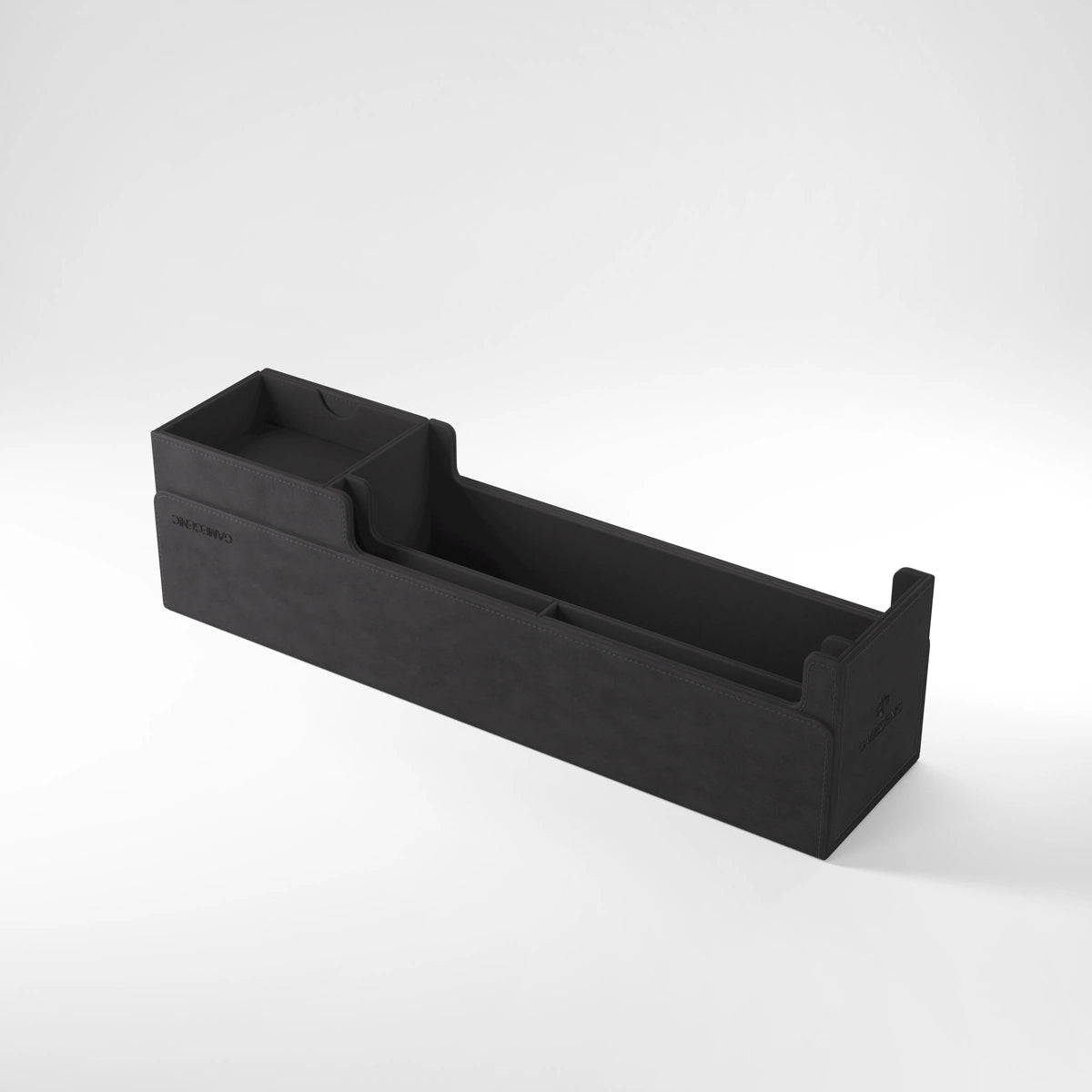 This multi-functional box is designed to perfectly fit 400 double-sleeved, or 540 single-sleeved cards*. Two removable drawers with ingenious magnetic flaps provide easy access to tokens, sleeved cards, or full decks. The top compartment can be used to store played cards, accessories, or as a mini dice tray.