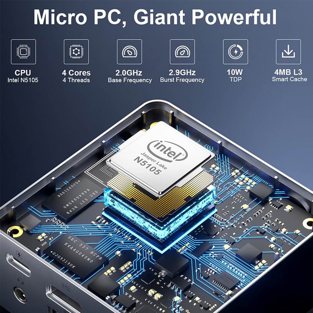 .CPU: Intel Celeron N5105, 10nm, 4C/4T(4M L3 Cache, 10W TDP, Base Clock 2.0Ghz, up to 2.9Ghz)