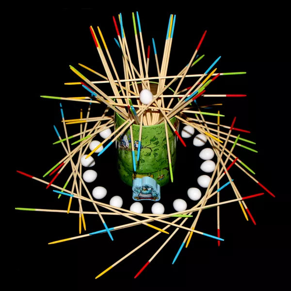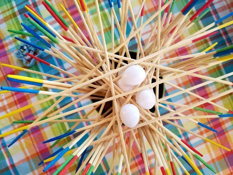 On your turn in Go Cuckoo!, you put one standing stick on the nest. If both ends of the stick have the same color, you may choose to lay an egg on it. Otherwise, you take another stick whose top color is the same as the hiding color of the previous one, up to three sticks. Your turn ends after laying an egg or putting the third stick with different colors. There are penalties for a stick touching the ground or eggs falling from the nest.