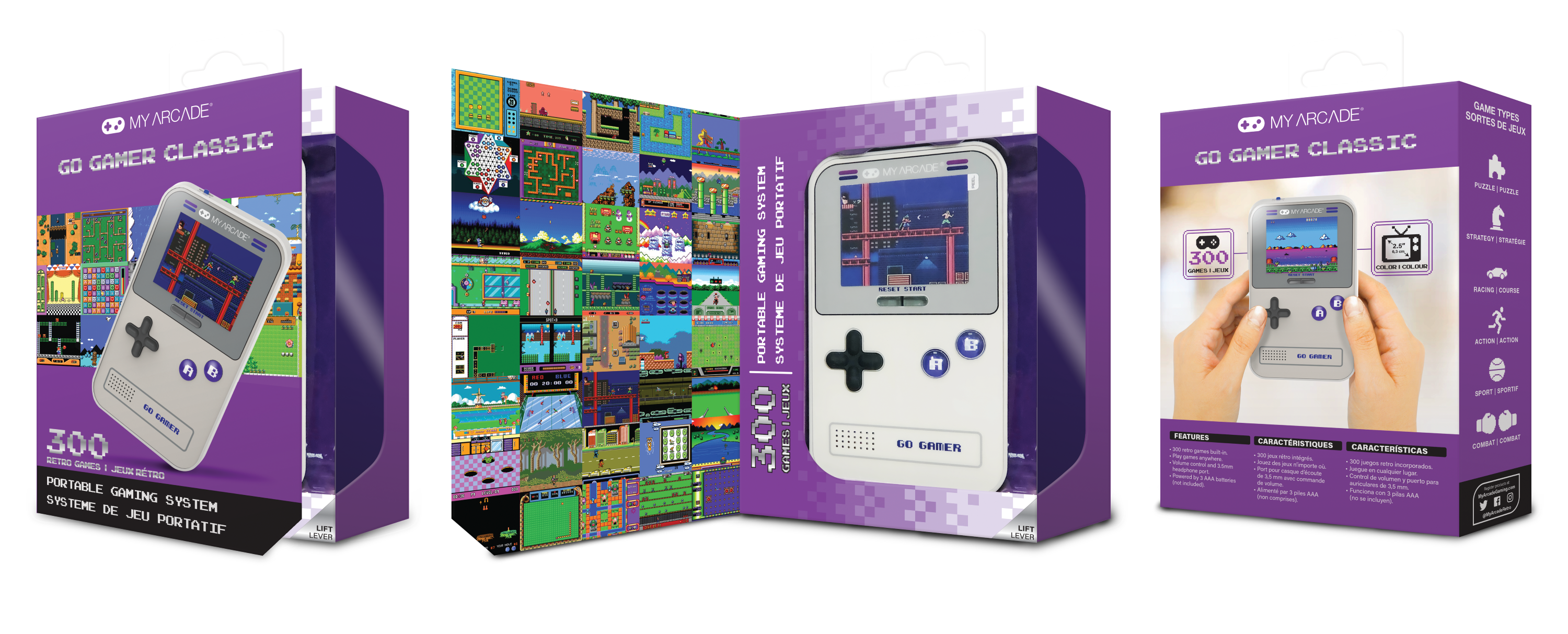Soar the skies, solve puzzles, play soccer or tennis and much more. The handheld gaming system Go Gamer Classic is loaded with 300 fun and easy to play video games! Simply power on the system and start playing, anywhere, anytime! Perfect at home, in the car or just about anywhere you can imagine! Fits easily in your pocket, purse, bag or backpack!