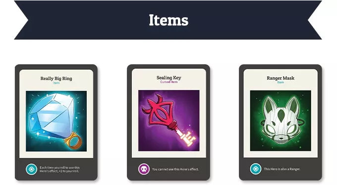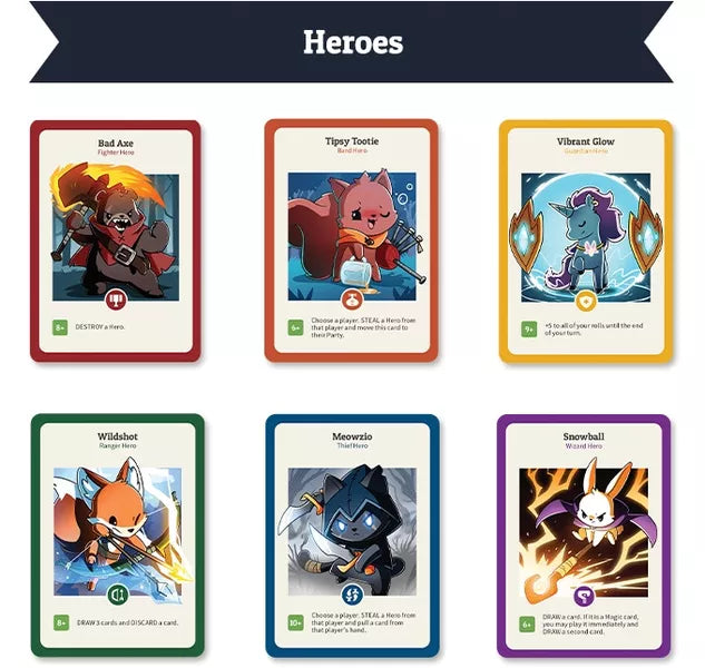 Don't like what your opponent just played? Throw down a challenge! Challenge cards can be played instantly to try to stop another player from playing a hero, item, or magic card. Playing a challenge card initiates a 1V1 challenge in which you and another player both have to roll the dice. If they win the challenge, they still get to play their card, but if you win the challenge, you get to send their card directly to the discard pile!
