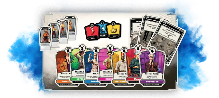 1 gameboard, 6 monster mats, 6 monster figures, 7 hero tiles, 7 hero standees, 10 legend standees, 19 bases, 60 item tokens, 4 lair tokens, 26 monster tokens, 1 terror marker, 1 frenzy marker, 30 monster cards, 20 perk cards, 5 reference cards, 1 item bag, 3 dice, and rulebook.