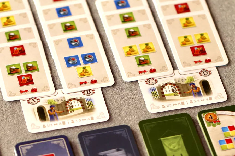 On their turn, players must choose to play either a Location card or a Guild card. Location cards will allow all merchants to perform the action of the specified location, or the action of an adjacent space on their sheet. If a player would rather prevent others from taking this follow action, they can instead play a Guild card, which is expensive but triggers powerful effects.