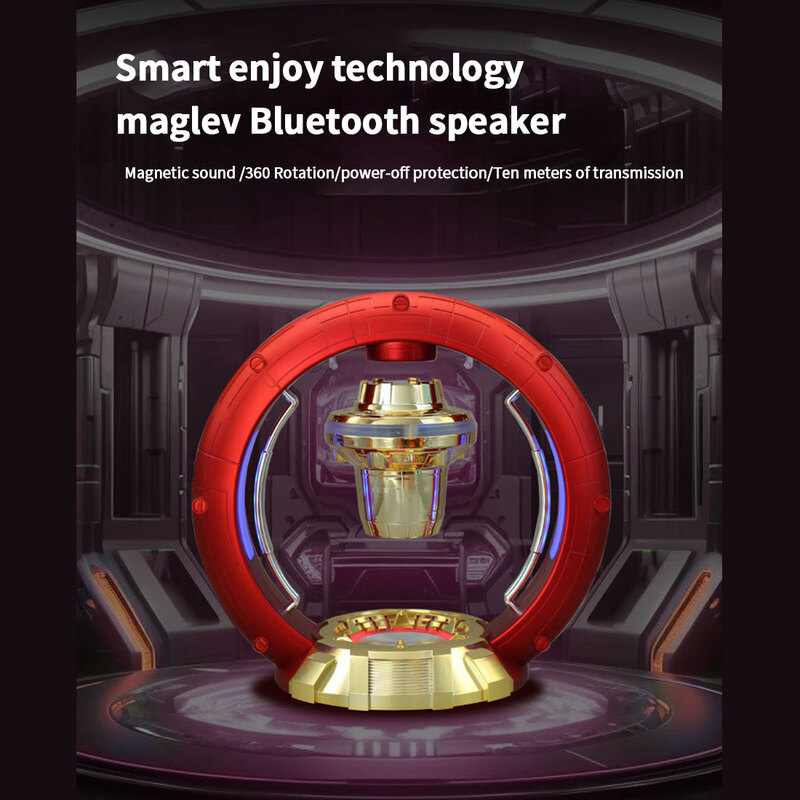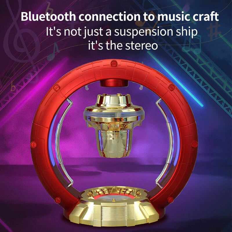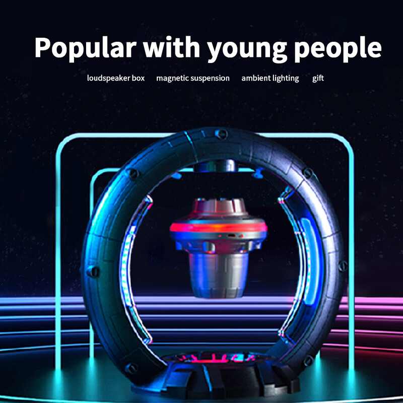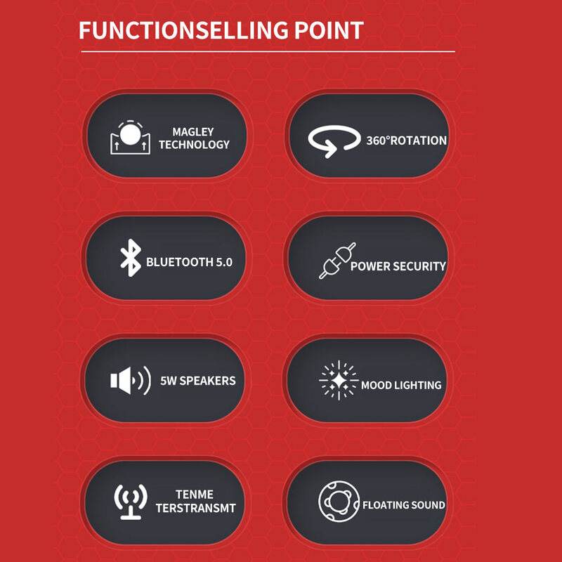 .Mesmerizing LED Visual Effects: Experience a fantastic atmosphere with colorful LED lights that illuminate both the floating Bluetooth speaker and its base, creating an enchanting visual display in the dark..360° Rotation & Immersive Stereo Sound: Enjoy premium quality stereo sound with a built-in 5W audio driver. The speaker rotates 360 degrees, delivering immersive sound that envelops your space, whether you're listening to music, watching movies, or gaming.