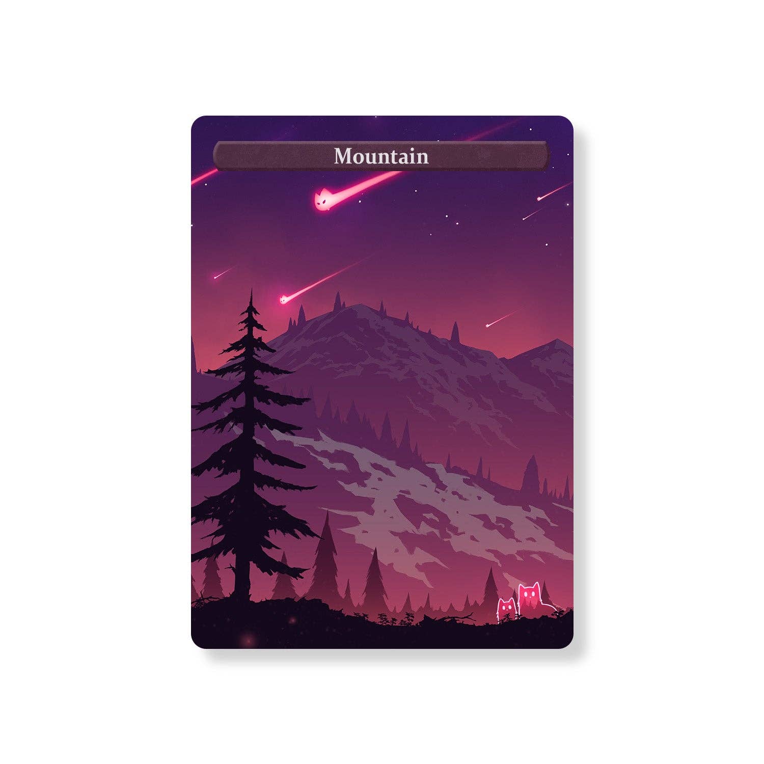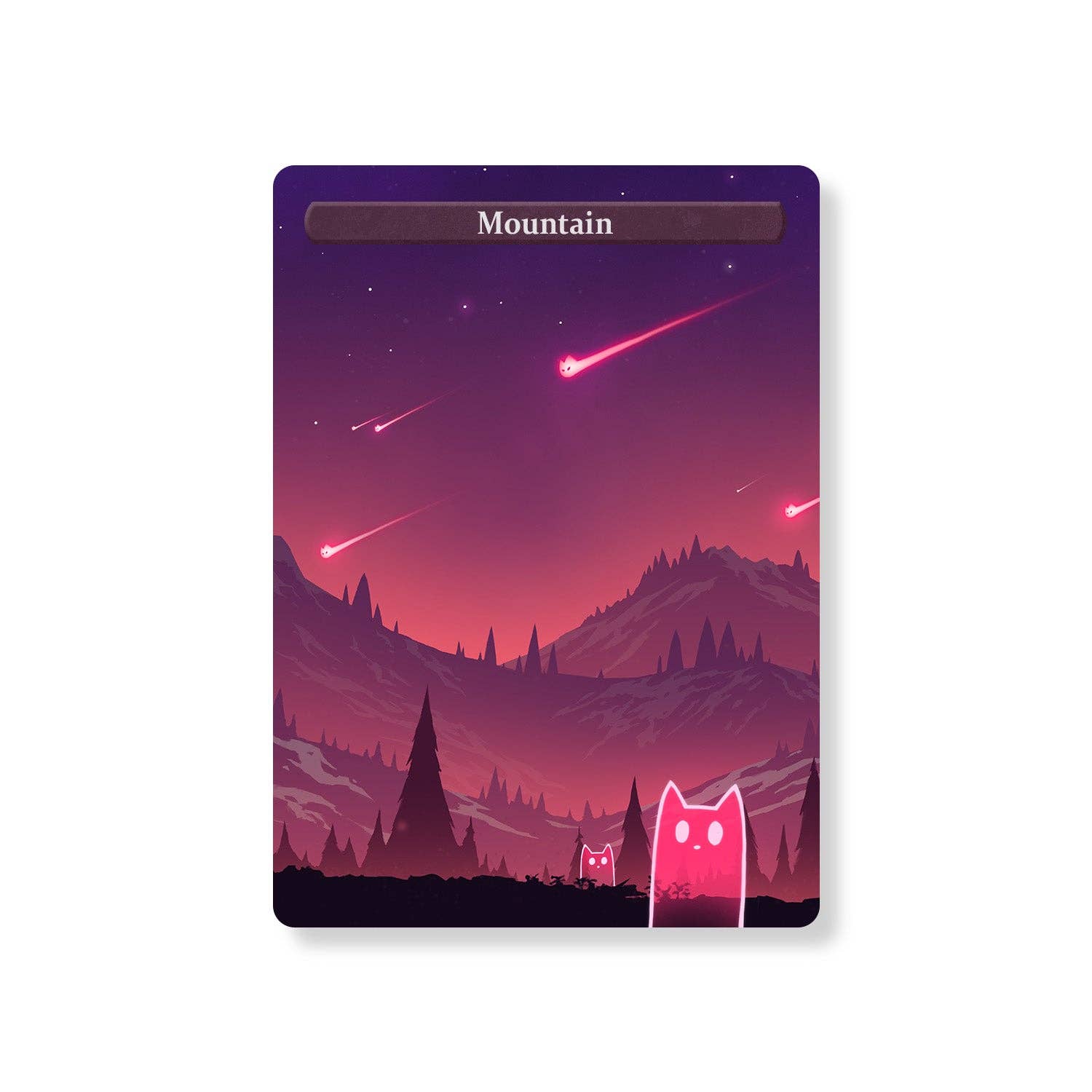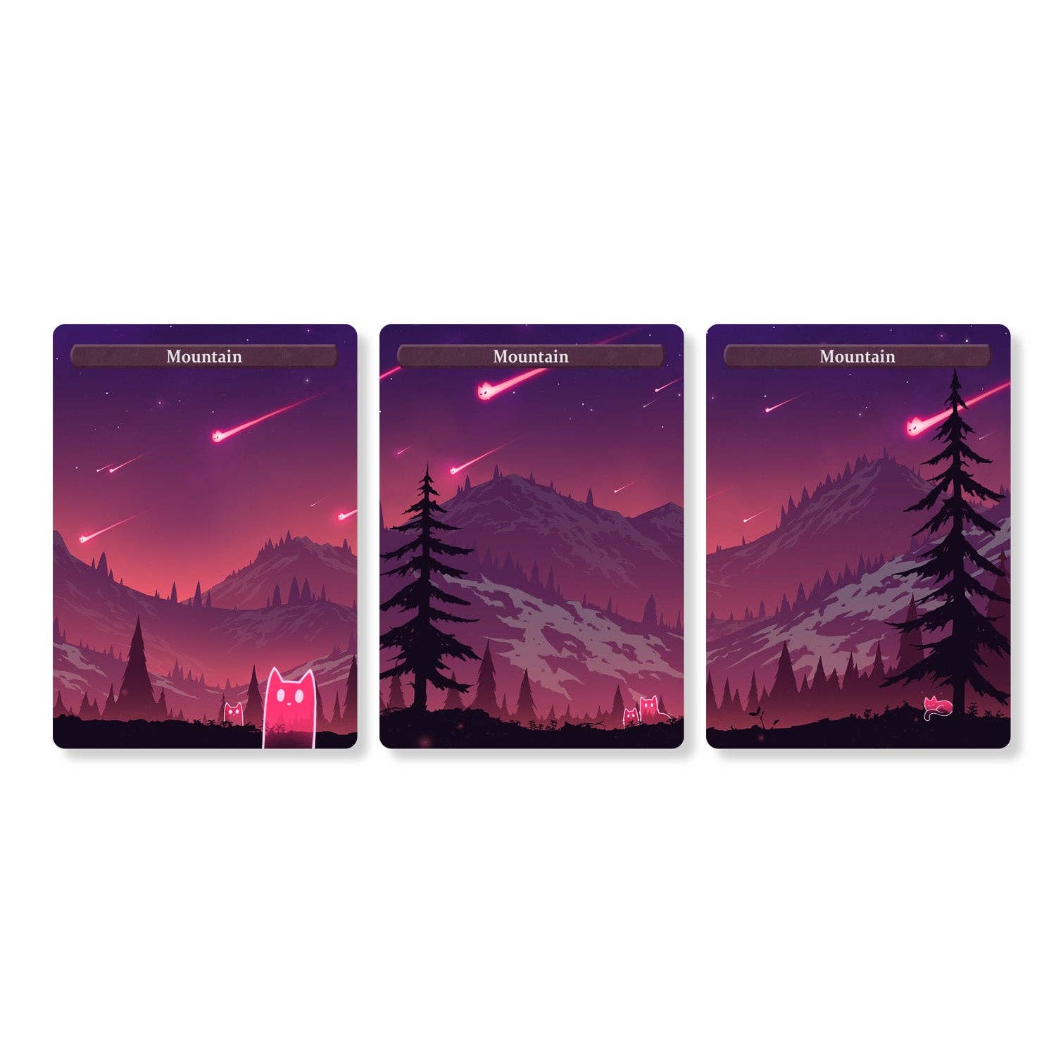 These MtG basic land proxies can be placed together to form a scene covered with cats! * Each card is sized identically to MtG cards and fit in all MtG card sleeves. * Each card is double-sided; showing the basic land type header on the front, and full artwork (no header) on the back! * A set contains three cards that create a scene. * A pack contains five sets of the same basic land type, for a total of 15 lands (five sets of three).