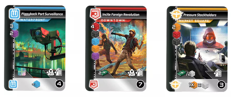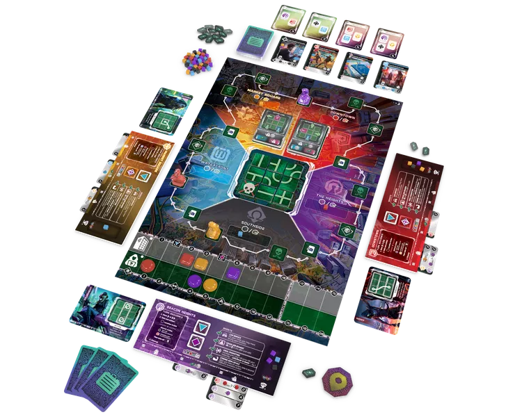 Metrorunner is a competitive worker-movement and resource-collection game for 1-5 players set in a high-tech neon future featuring a tile-puzzle mini-game. Circling the districts of Mirror City on the Metro line, you compete for resources as you race to fulfill contracts for the ruthless and greedy mega-corporations. Grow your influence and gain reputation, squeezing every credit you can from corrupt factions, while you secretly steal their data for your home district!