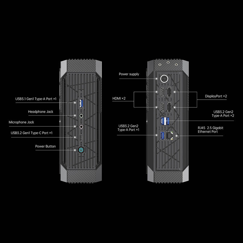 .Ports & Buttons: RJ45 2.5 Gigabit Ethernet Port ×1, USB 3.2 Gen2 Type-A Port ×1 (In Front), USB3.2 Gen2 Type-A Port ×1, USB3.2 Gen1 Type-A Port ×2, USB3.2 Gen1 Type-C Port ×1(In Front), USB4 Port ×2(In Back), HDMI (4K@60Hz) ×2, Clear CMOS ×1, Microphone Jack ×1, Headphone Jack ×1