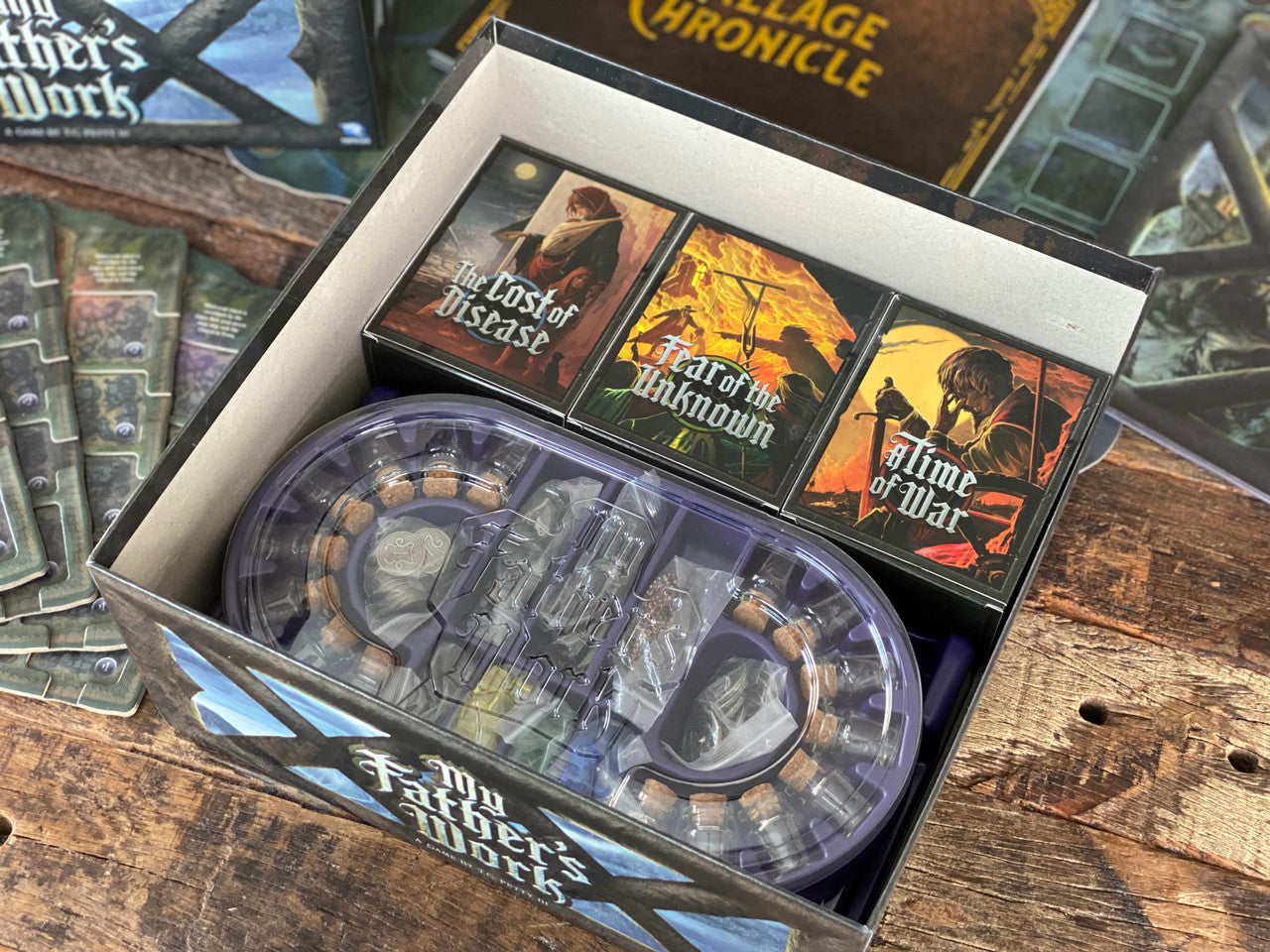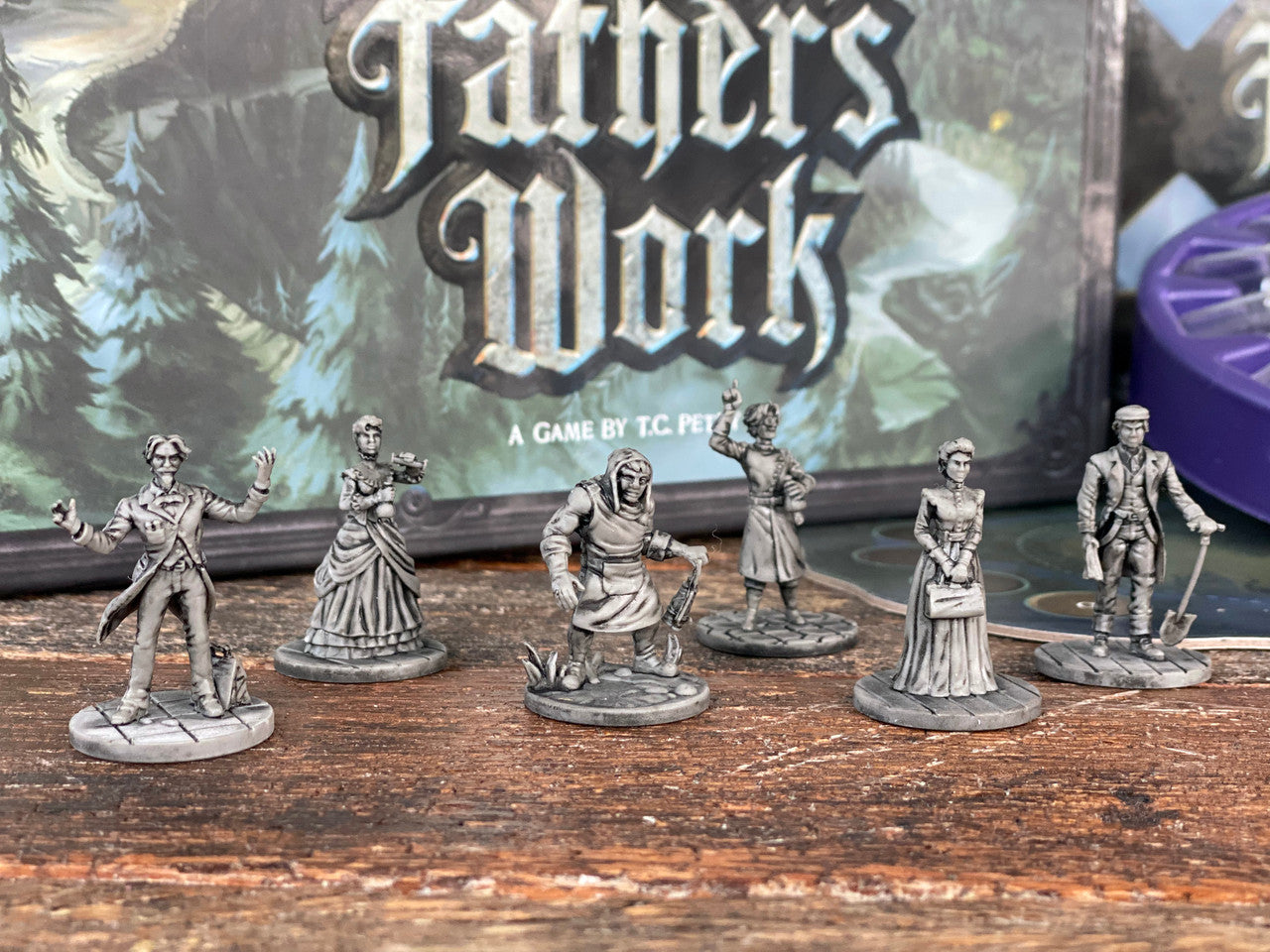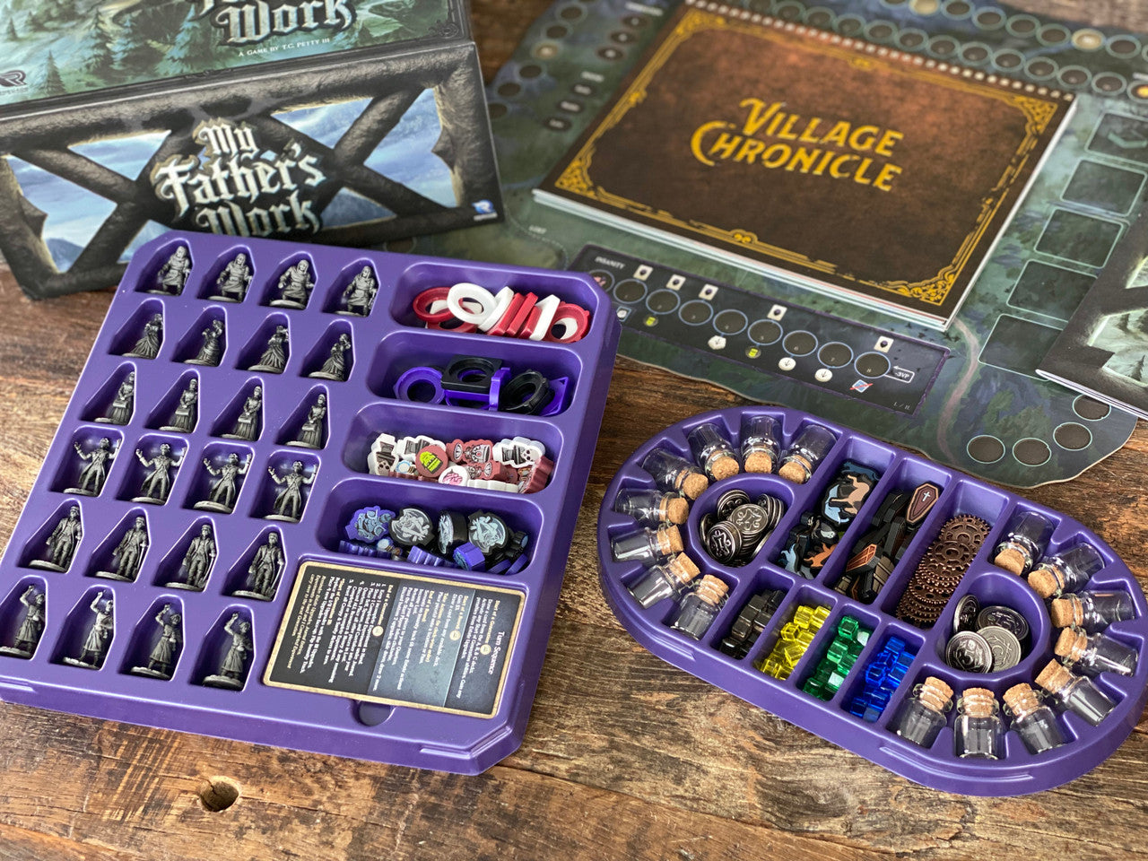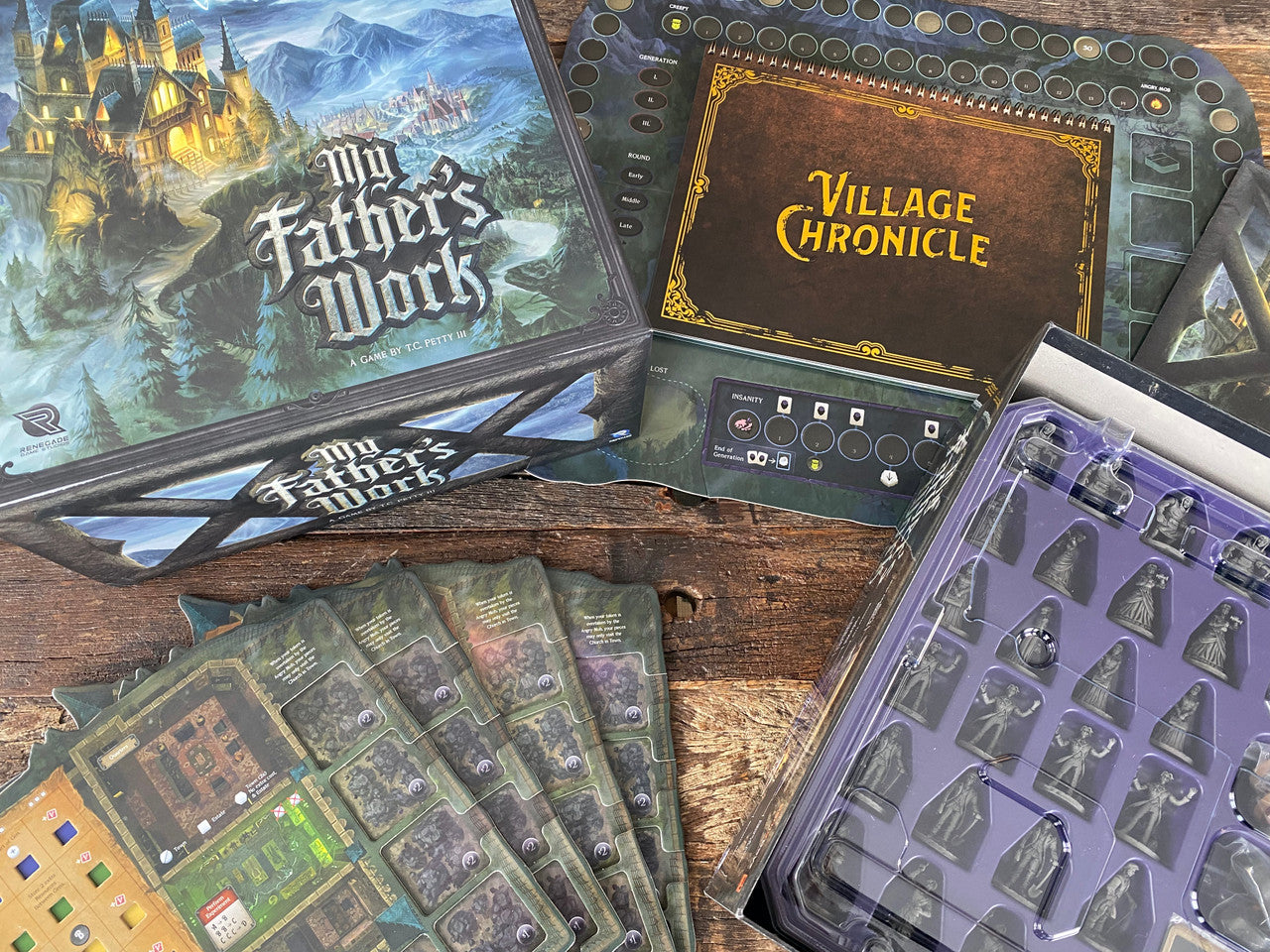 In My Father's Work, players are competing mad scientists entrusted with a page from their father's journal and a large estate in which to perform their devious experiments. Players earn points by completing experiments, aiding the town in its endeavors, upgrading their macabre estates, and hopefully completing their father's masterwork.