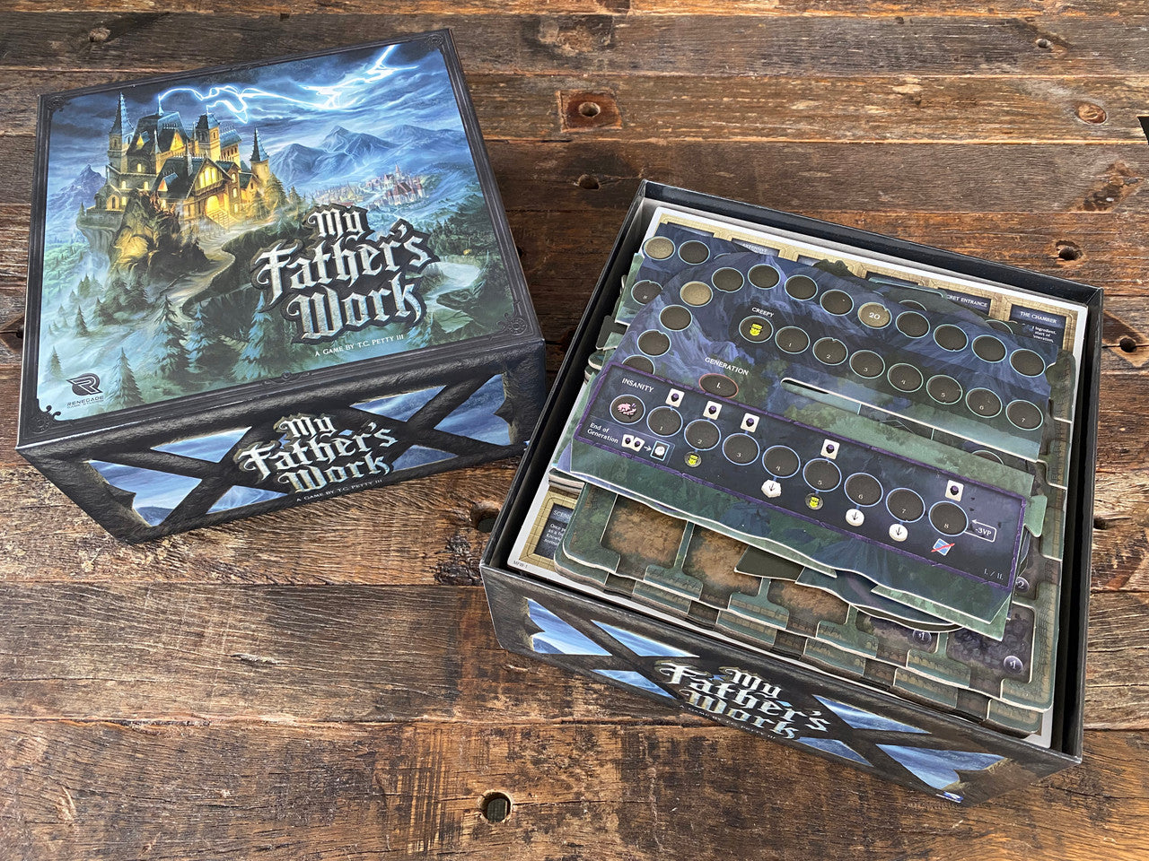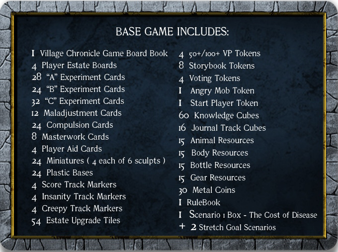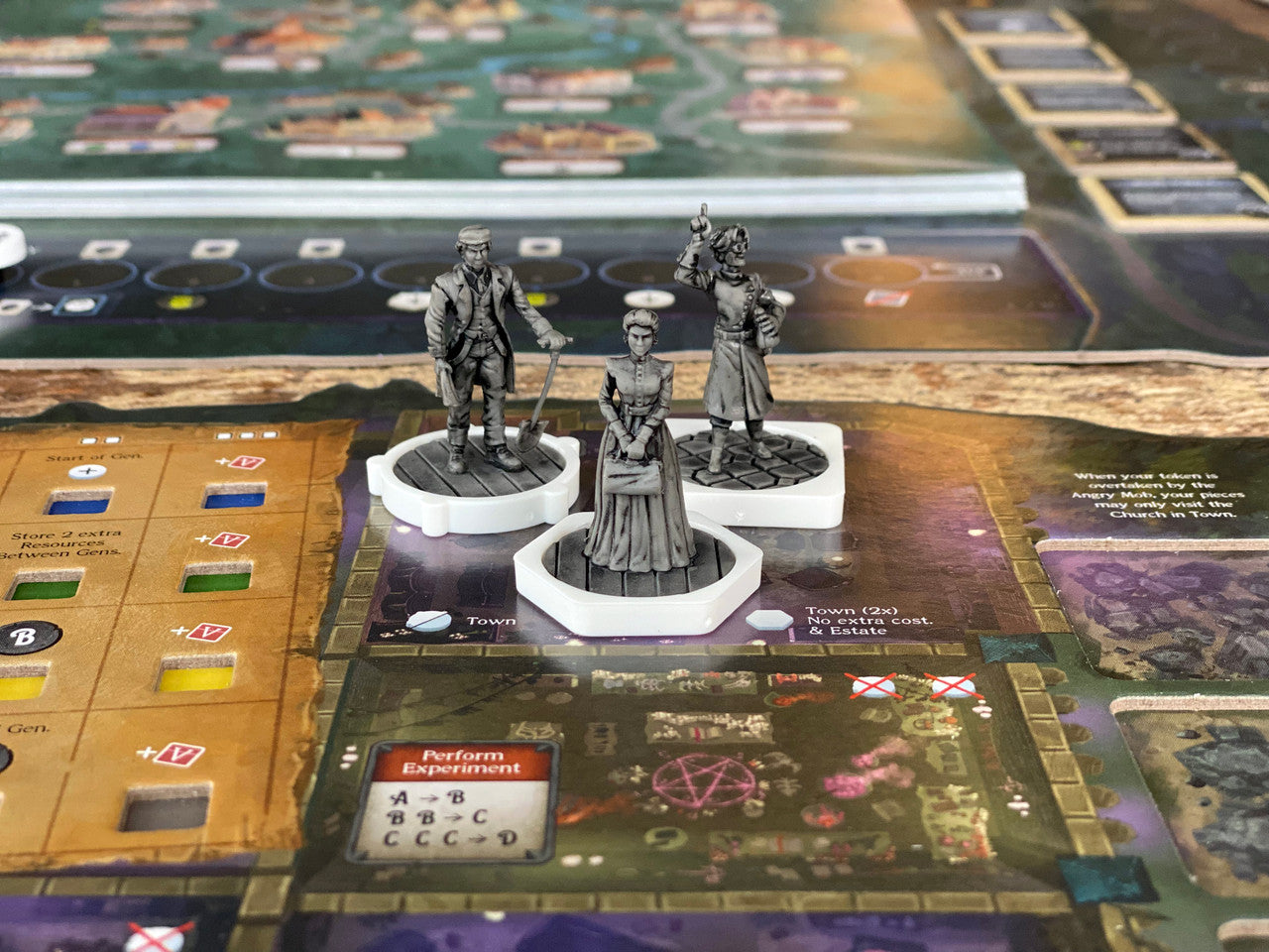 But they have to balance study and active experimentation because at the end of each generation, all of their experiments and resources are lost to time until their child begins again with only the 'Journaled Knowledge and Estate' they have willed to them — and since the game is played over the course of three generations, it is inevitable that the players will rouse the townsfolk to form angry mobs or spiral into insanity from the ethically dubious works they have created. The player with the most points at the end of three generations wins and becomes the most revered, feared, ingenious scientist the world has ever known!
