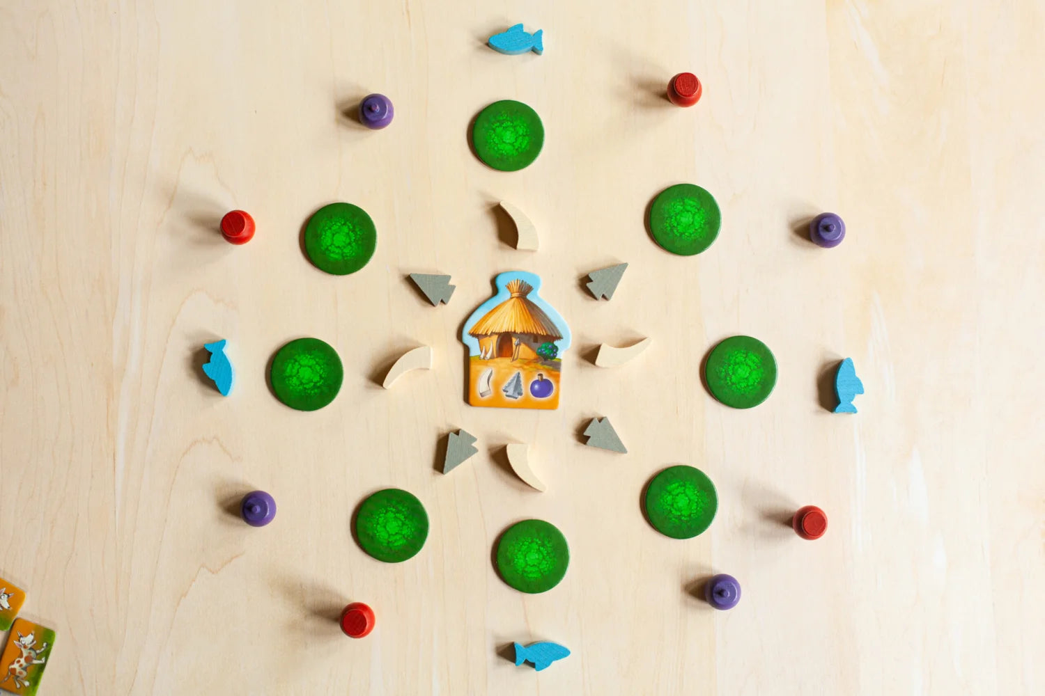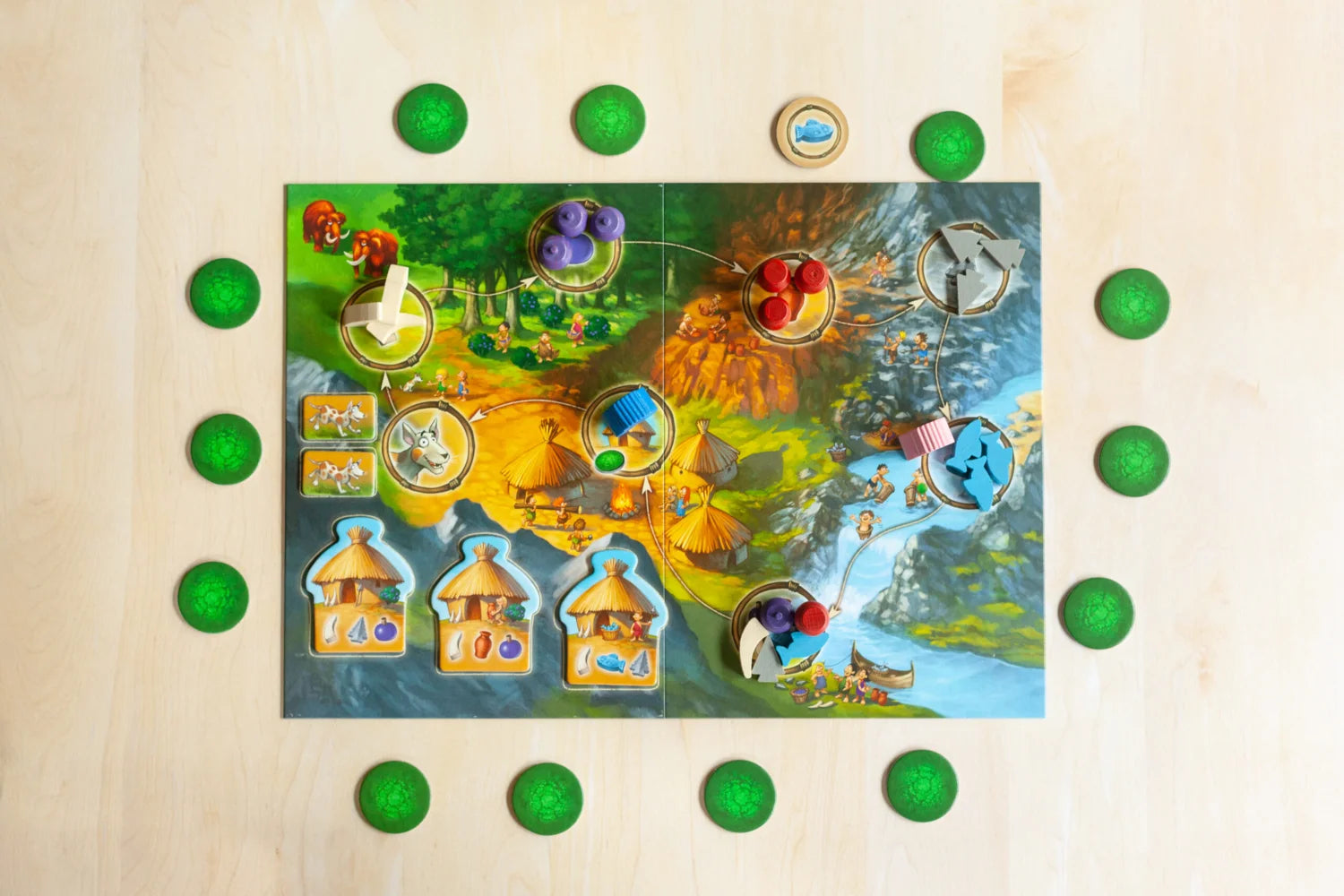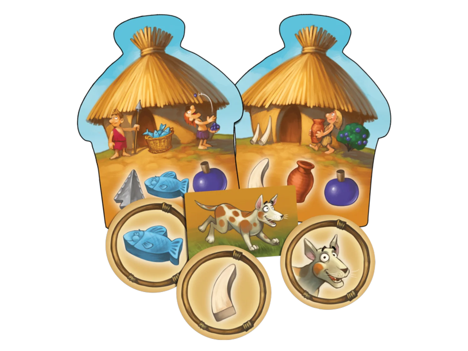 The Stone Age was very different from the modern world. In My First Stone Age, players experience this period 10,000 years ago through the eyes of two Stone Age children, Jono and Jada, along with their friend Martin the mammoth. Learn about life at the dawn of humanity while gathering and trading valuable resources such as berries, fish, pots, arrowheads, and animal teeth. If you collect the required resources, you can build a hut and add it to your settlement. Your best friend and loyal wolfhound, Guff, might even drop by to help. The first player to build three huts wins the game!