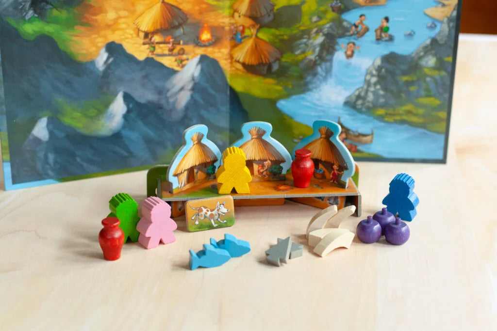 My First Stone Age is based on the classic family game Stone Age. This stand-alone game combines elements of memory, resource gathering, and set collecting games into an experience accessible to players age five and up. Players take actions based on the forest tokens they flip over each turn. But as soon as a hut is built, you flip those tokens back over and swap two of them. Pay careful attention and put your memory to the test as you search for the tokens that will lead you to the best resources. Enter the world of the Stone Age, develop your village, and let your imagination take you back to a time of wonder and fun!