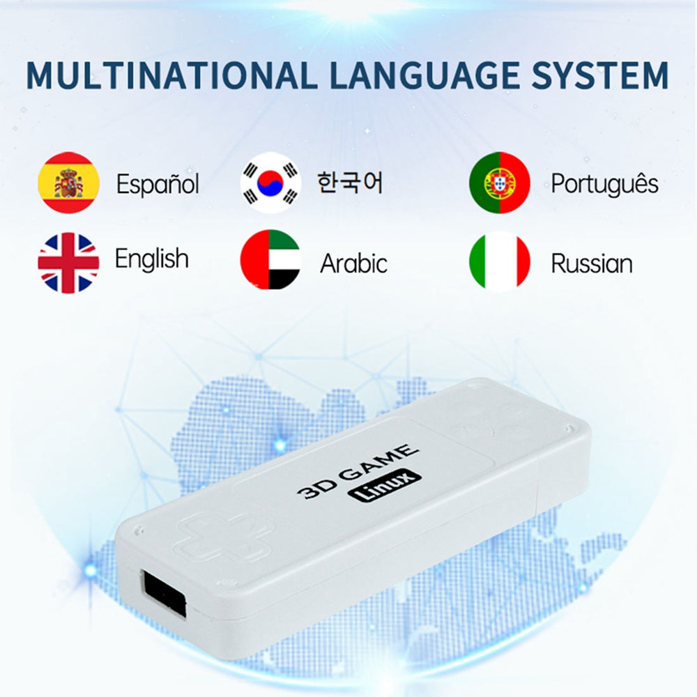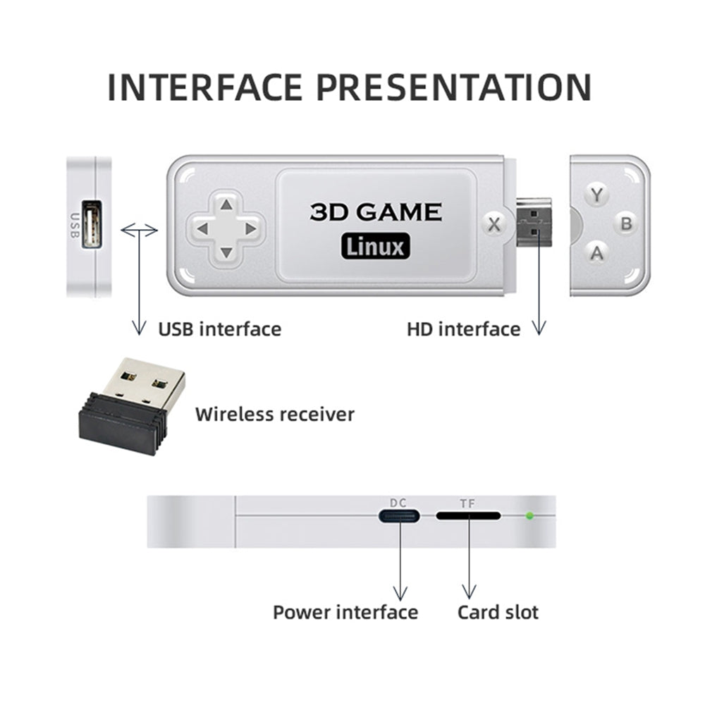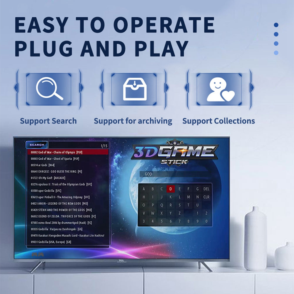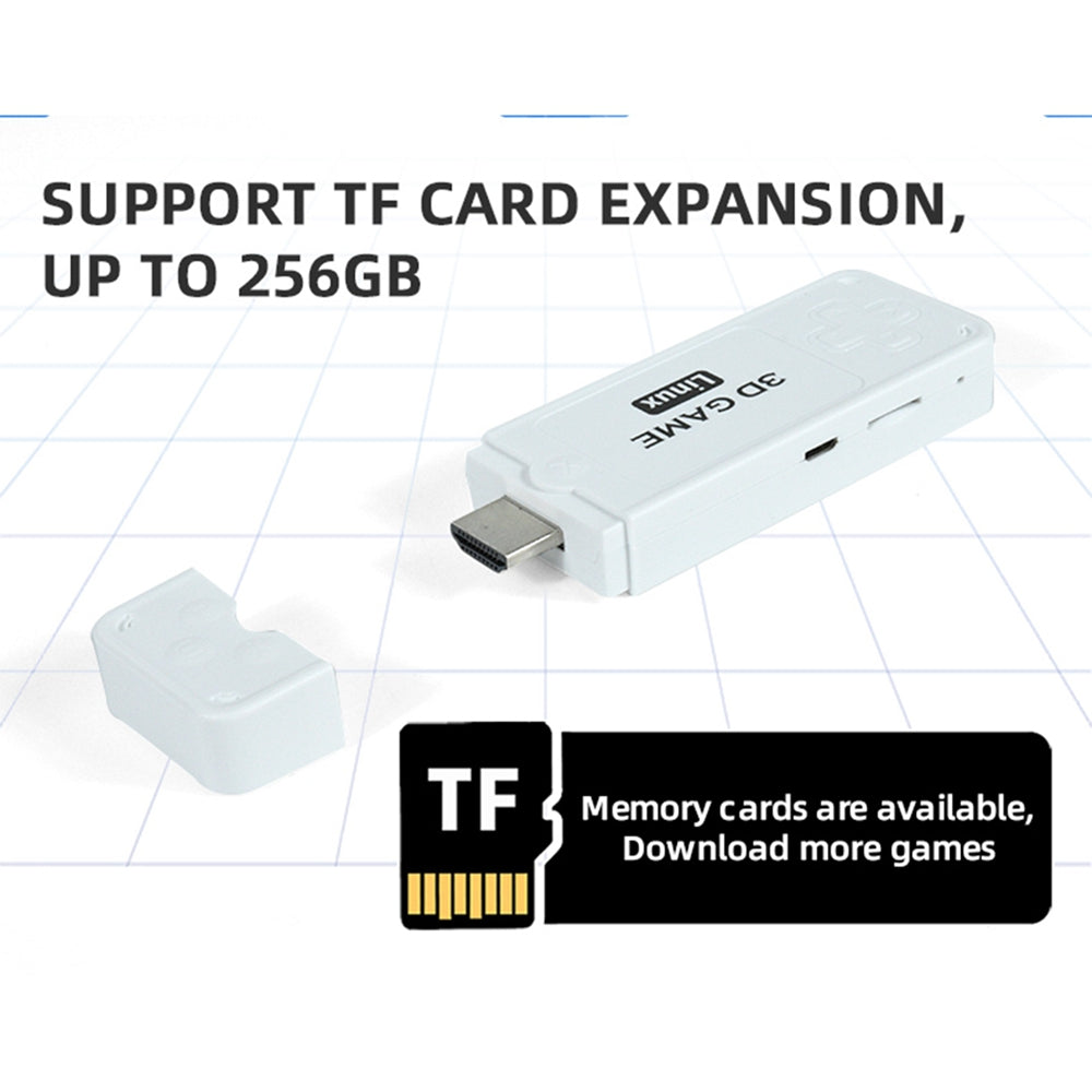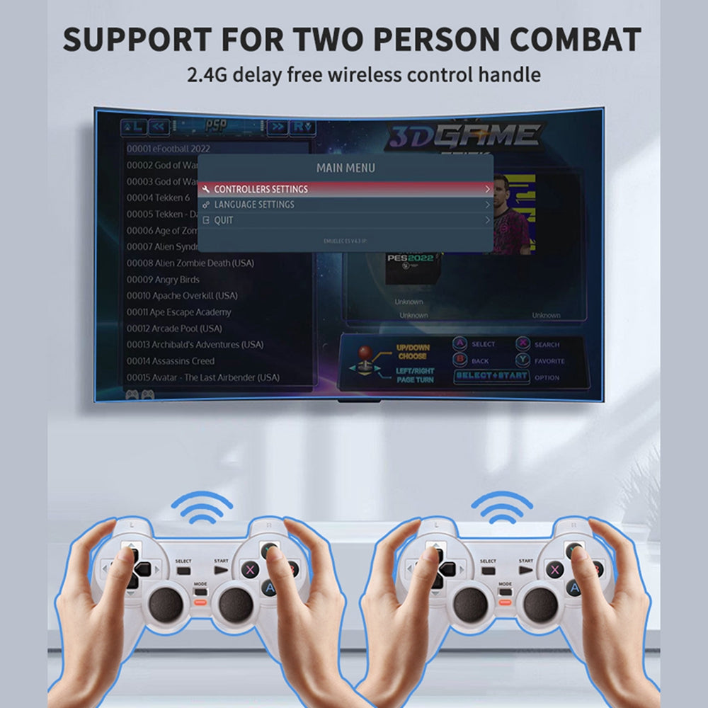 .The plug-to-play console allows HDMI 4K 60fps interface output without conversion. It can be connected to computer, TV, monitor, projector and so on..Two 2.4G wireless control gamepads are provided for two players to have fun without delay. Functions include game search, game collection, achieve & load, and game pause.
