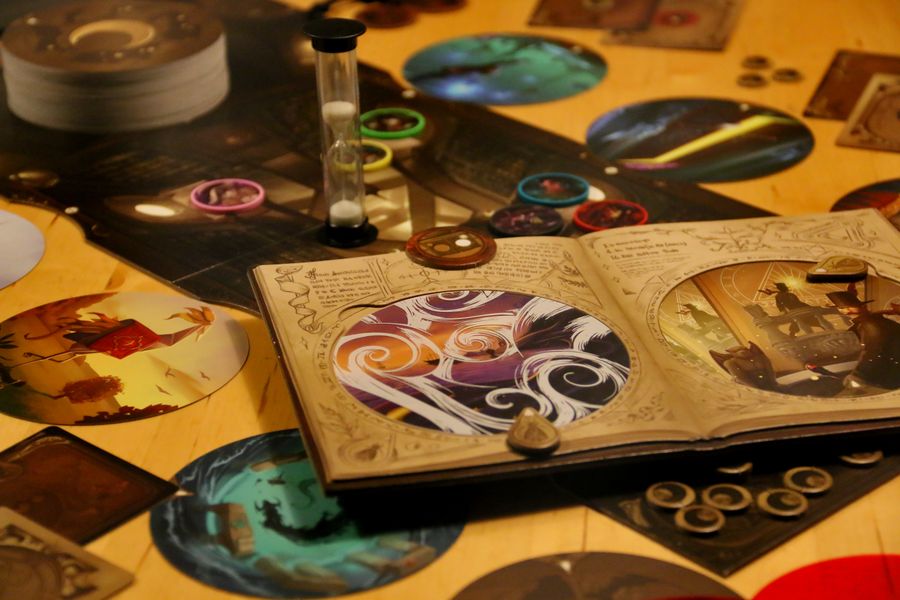 The Grimoire guides his team towards the exit using images, on which he points at certain details. In cooperation, the other players have to find it as quickly as possible while avoiding picking the wrong cards.
