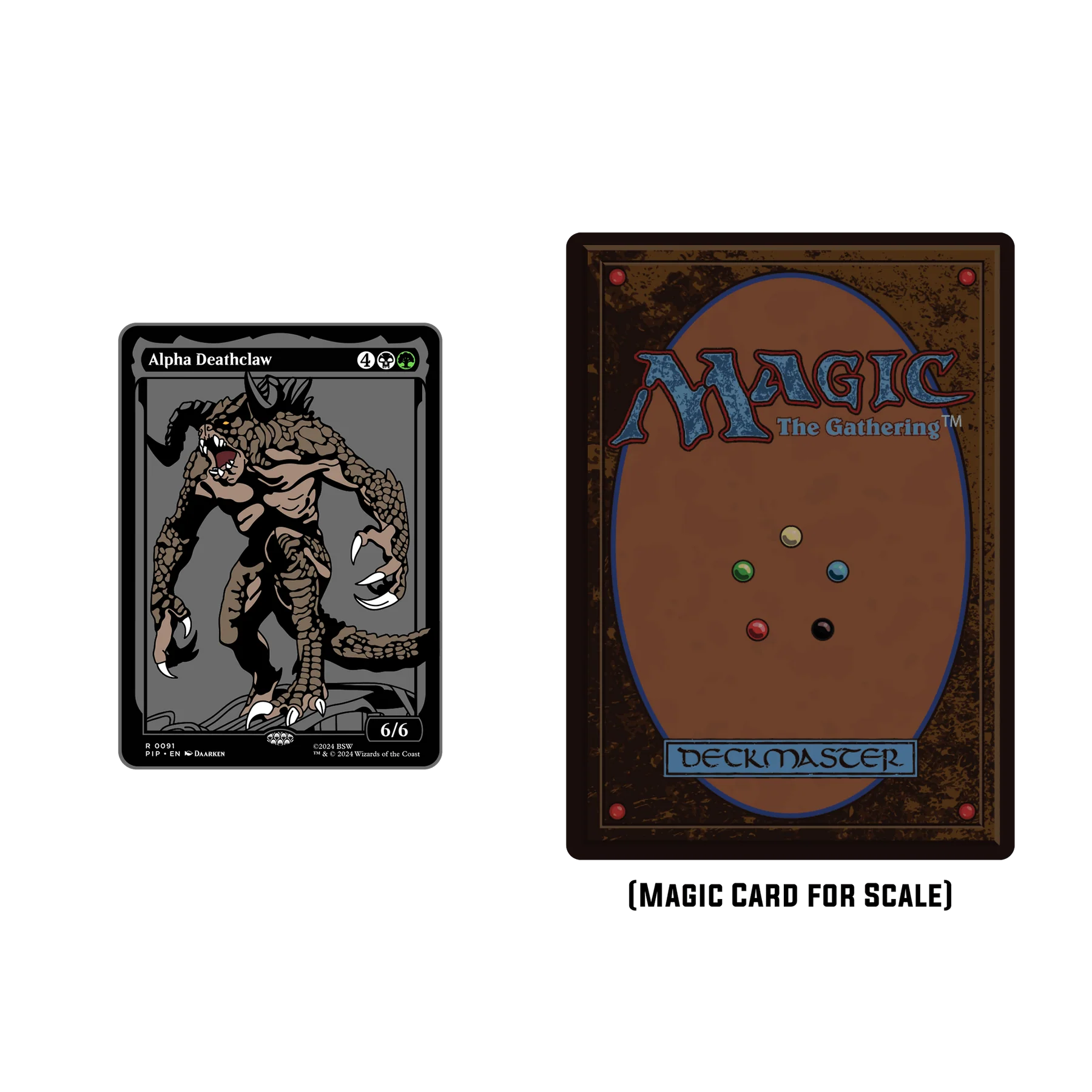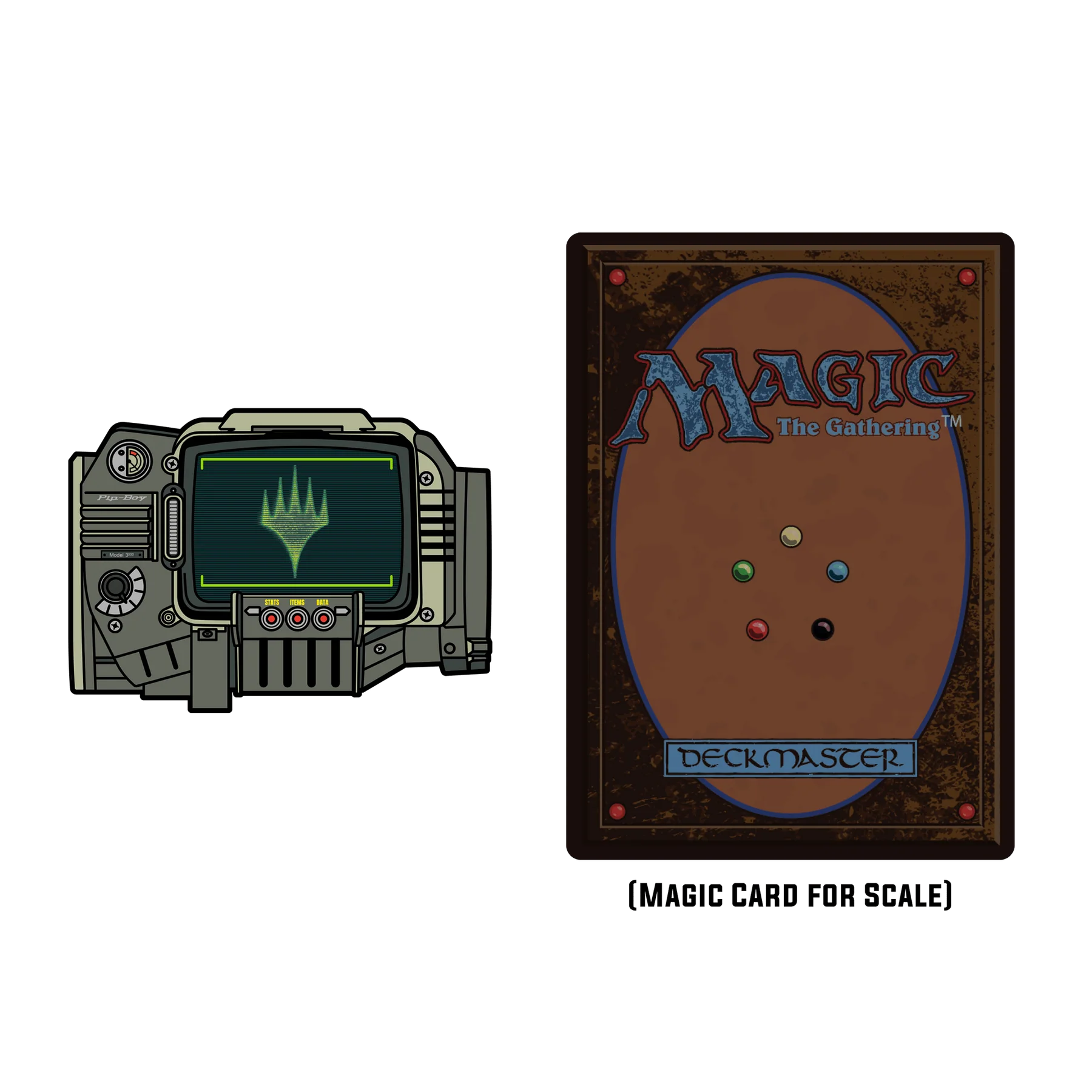 Get your Limited Edition Magic: The Gathering X Fallout Pin Set with ARt Card!Scan any of the pins to access animations and downloadables.Comes with a Alpha Deathclaw, Pip Boy and Yes Man along with a Mirelurk Queen ARt Card!