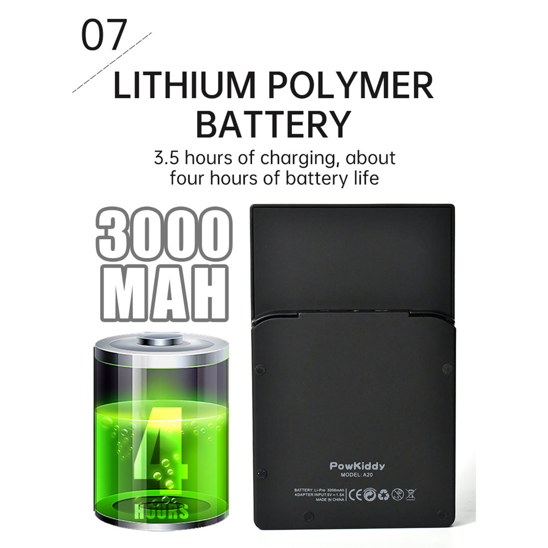 Battery: Polymer lithium ion battery 3000 mAh, playtime more than 4 hours