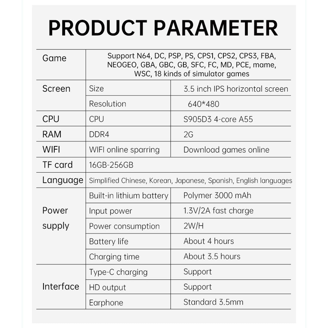 🎮The 3.5-inch IPS screen (640 x 480) and S905D3/4-core A55/main frequency 1.9GHz/Android 9.0 make this game console a must-have for gaming enthusiasts. Enjoy 8G built-in memory and expandable storage up to 256GB via the external TF card slot.
