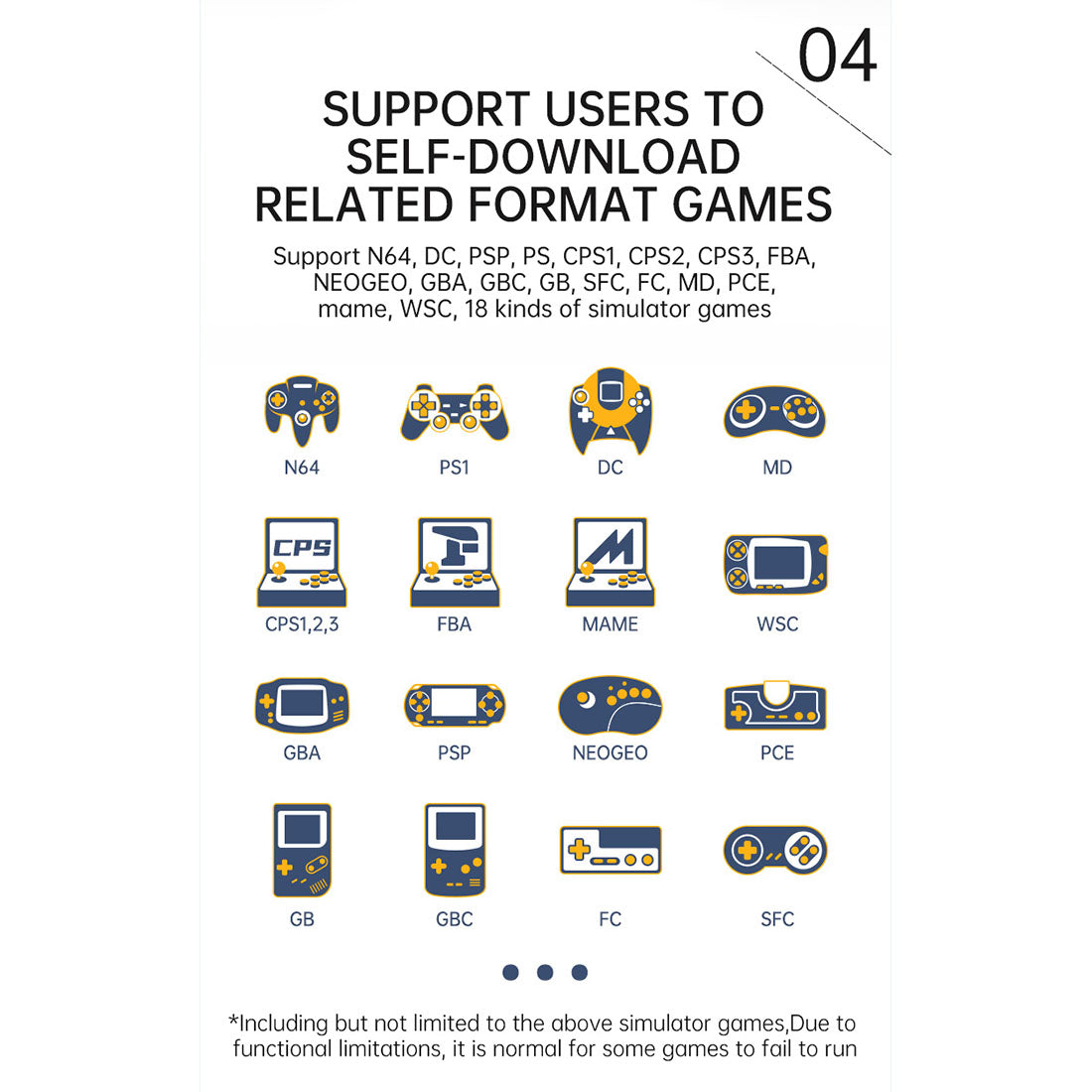 game Support: N64, DC, PSP, PS, CPS1, CPS2, CPS3, FBA, NEOGEO, GBA, GBC, GB, SFC, FC, MD, PCE, mame, WSC, 18 kinds of simulator games, support users to download related format games
