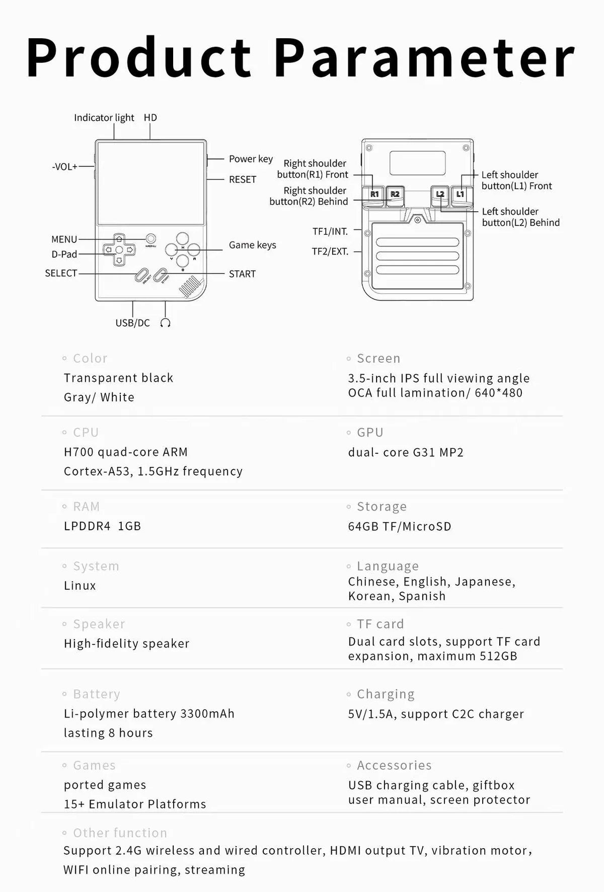 4. Multi-function: Support 2.4G wireless handle and wired handle connection, bluetooth handle connection, can be connected to a computer, TV, monitor, projector play through HDMI, with a vibration motor, high-fidelity speakers. WIFI online sparring, support Moonlight streaming. With archive reading game function and so on.Specifications