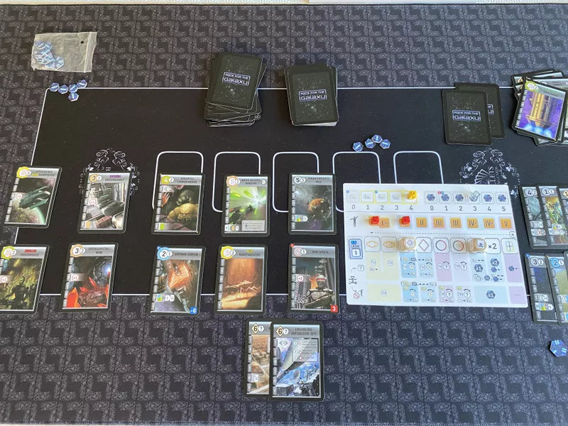 In the card game Race for the Galaxy, players build galactic civilizations by playing game cards in front of them that represent worlds or technical and social developments. Some worlds allow players to produce goods, which can be consumed later to gain either card draws or victory points when the appropriate technologies are available to them. These are mainly provided by the developments and worlds that are not able to produce, but the fancier production worlds also give these bonuses.