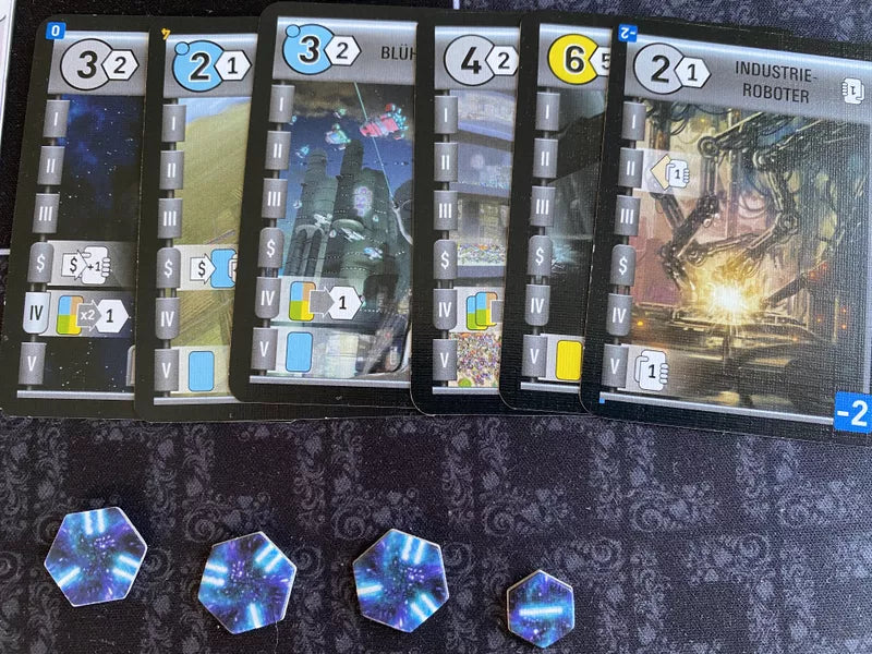 At the beginning of each round, players each select, secretly and simultaneously, one of the seven roles which correspond to the phases in which the round progresses. By selecting a role, players activate that phase for this round, giving each player the opportunity to perform that phase's action. For example, if one player chooses the settle role, each player has the opportunity to settle one of the planets from their hand. The player who has chosen the role, however, gets a bonus that applies only to them. But bonuses may also be acquired through developments, so you must be aware when another player also takes advantage of your choice of role.