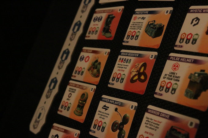 Over the course of the game, you learn the Martian languages and re-discover and study their technologies, which come in three levels and multiple classifications and which grant you special abilities. Along the way, you might pick up radiation from various actions, and you'll want to ditch that if possible so as not to lose points in the final scoring, which is mostly based on the tech you've assembled and your skill with languages.