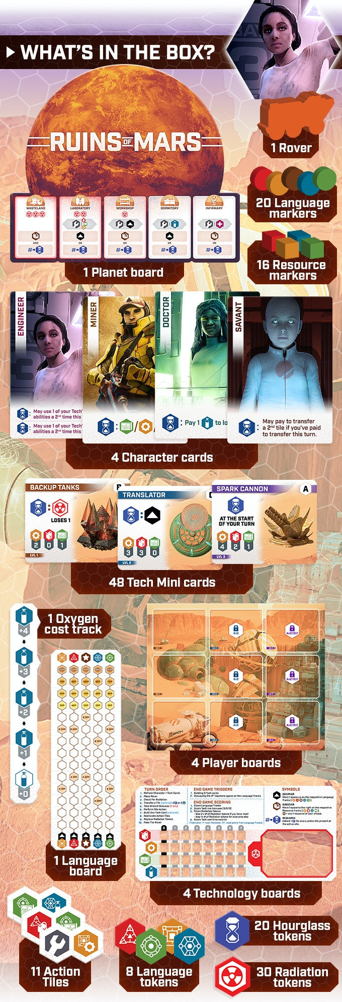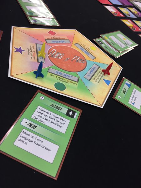 In Ruins of Mars, players compete to build out their arsenal of knowledge, attempting to understand the languages of ancient civilizations that colonized Mars and made it a hub of economic activity. The game is played around a board with five locations and eleven communal action tiles that are laid out at random underneath the board as evenly as possible.